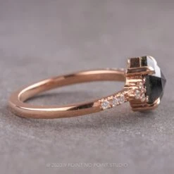 This beautiful ring features a gorgeous 1.48 carat black rose cut hexagon diamond. The diamond is a top quality natural diamond with unique tones and facets the catch the light. The hexagon diamond is flanked by GHSI brilliant cut diamonds, followed by GHSI brilliant cut diamonds set into the band to complete the look!