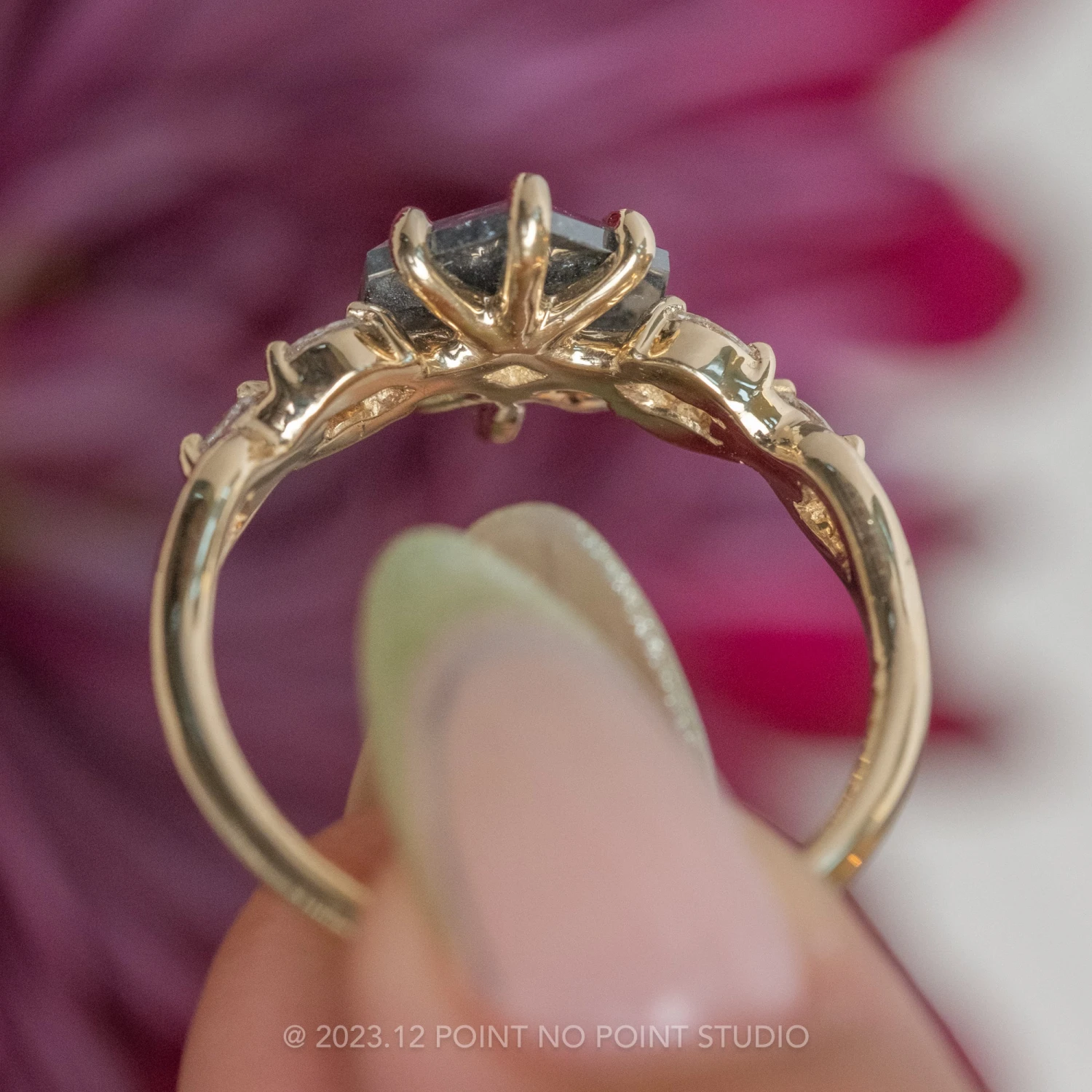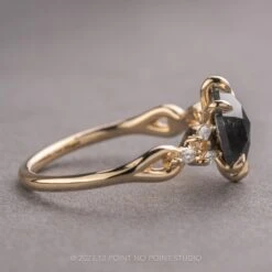 This striking ring features a unique organic design with twisting sides that showcases a 1.48 carat black rose cut hexagon diamond. The sides have GHSI marquise diamonds twisting down each side for that extra sparkle!
