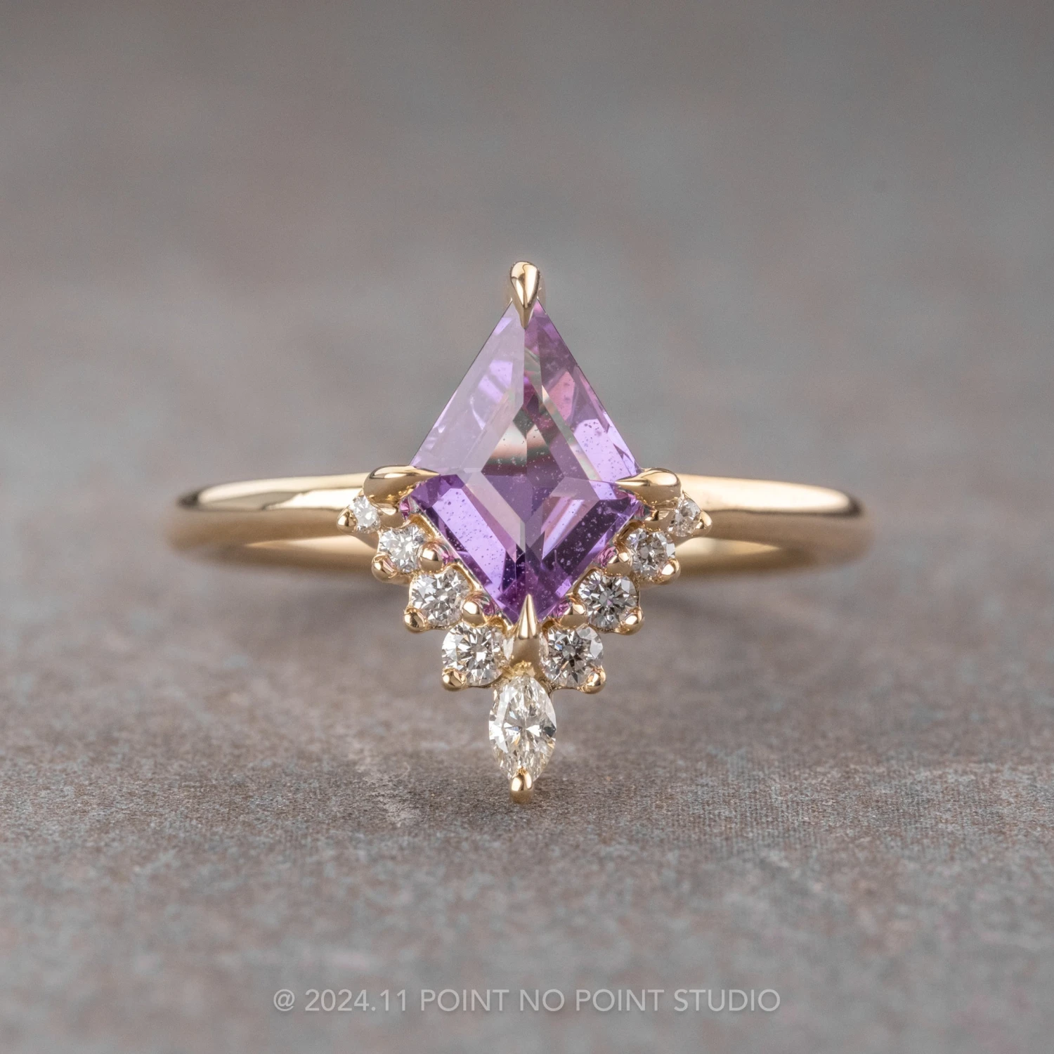 This timeless engagement ring features a striking 1.47 carat purple lozenge step cut sapphire. The sapphire is a top quality natural stone that has been heated to enrich its natural color and make it more vibrant. The lozenge sapphire is complimented by a half-halo of GHSI white accent diamonds with a sparkly white marquise diamond at the center.
