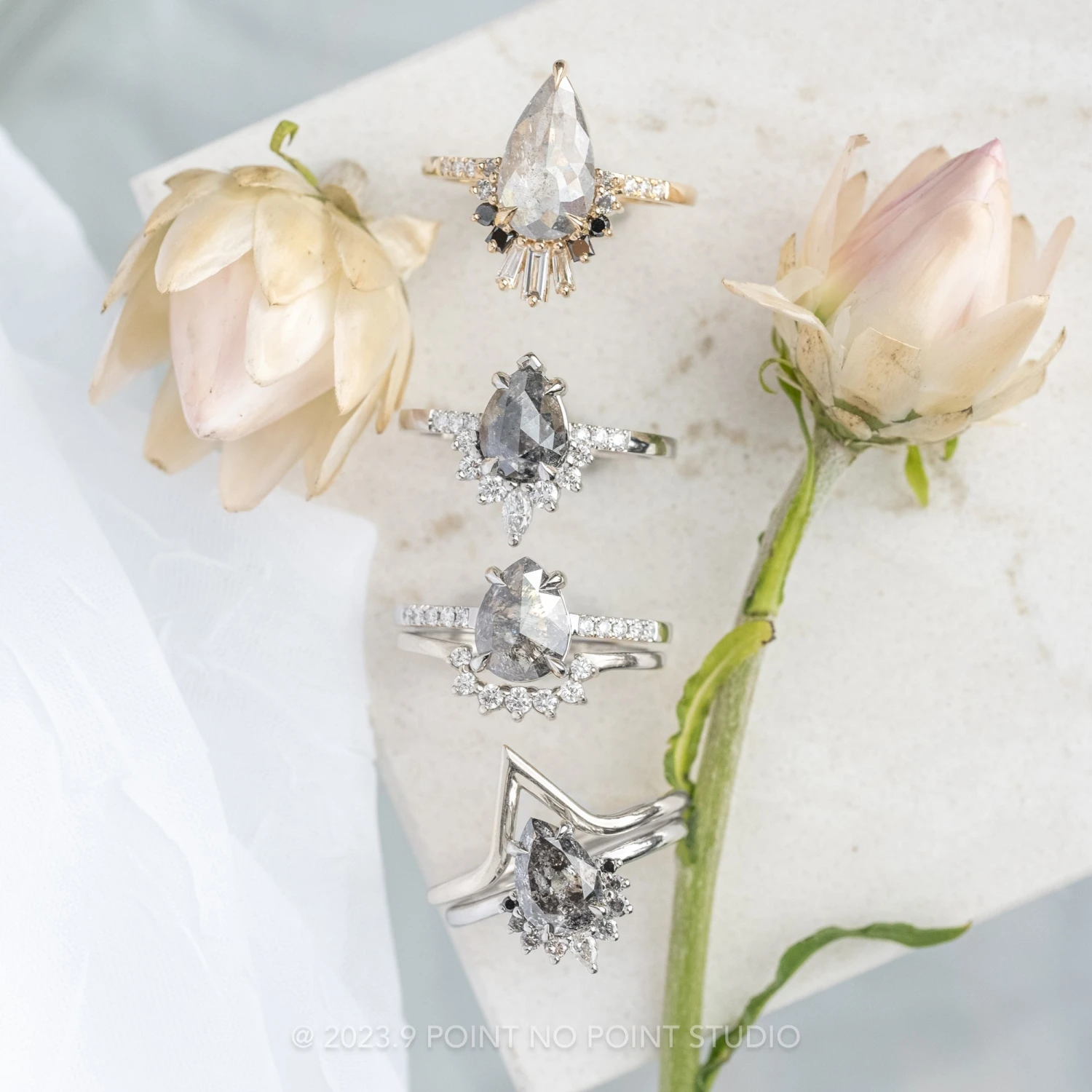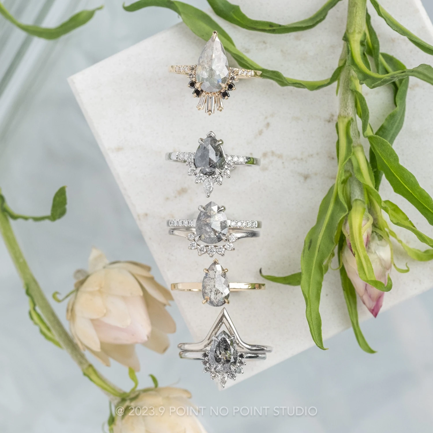 This engagement ring features a 1.51 carat salt and pepper pear shaped rose cut diamond. The diamond is a top quality, all-natural stone that has not been heat treated or enhanced in any way; the diamond is semi-translucent with unique tones and facets that catch the light. There are five GHSI white brilliant cut round accent diamonds set into the ring band on each side of the pear diamond to complete the look.