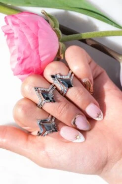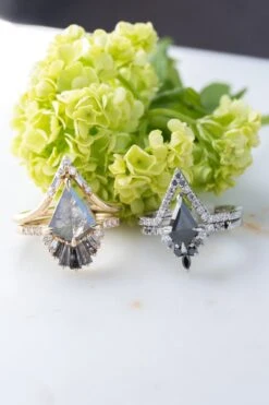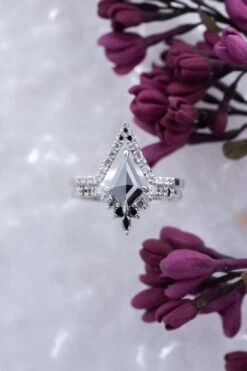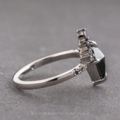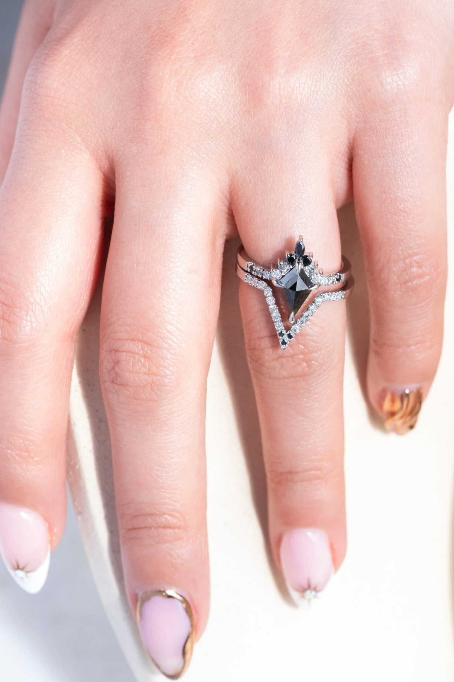 This timeless engagement ring features a striking 1.42 carat opaque black rose cut kite diamond. The diamond is a top quality natural diamond and has been set in a low profile 4 prong setting with a half-halo of faceted ombre diamonds with the focal point being a black marquise diamond. Followed by one white, grey and black brilliant cut diamond set into the band to complete the look!