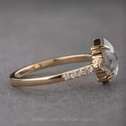 This engagement ring features a mesmerizing 1.51 carat icy salt and pepper rose cut hexagon diamond. The diamond is a top quality un-enhanced diamond; it is semi-translucent with unique tones and facets that catch the light. Flanked on either side by GHSI white triangle diamonds, followed by GHSI white round accent diamonds set into the band for that extra sparkle!