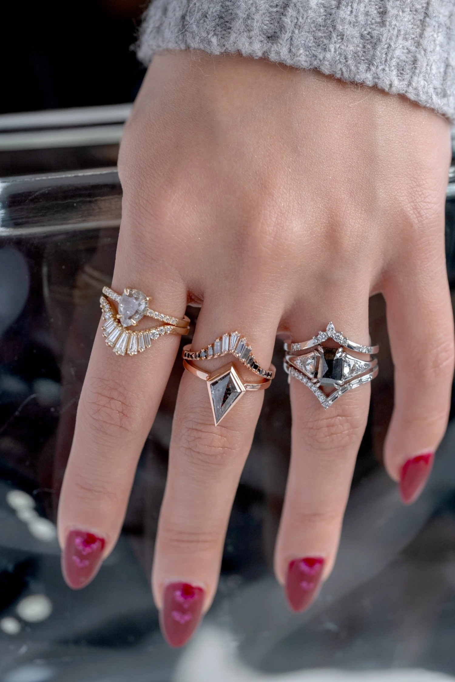 Shown pictured with our Ombre Wren, Ombre Valeria, Stardust and Diamond Vintage Vivian wedding bands, sold separately here.Â