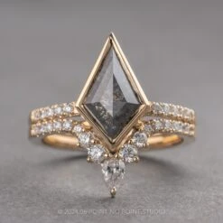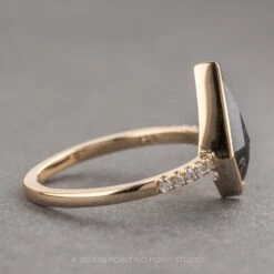 The ring features a beautiful 1.58 carat black speckled kite rose cut diamond. The diamond is a top quality natural diamond; it is semi-translucent with unique tones and facets that catch the light. The ring design is finished off with 5 sparkly GHSI white round accent diamonds set into the ring band to complete the look!Â
