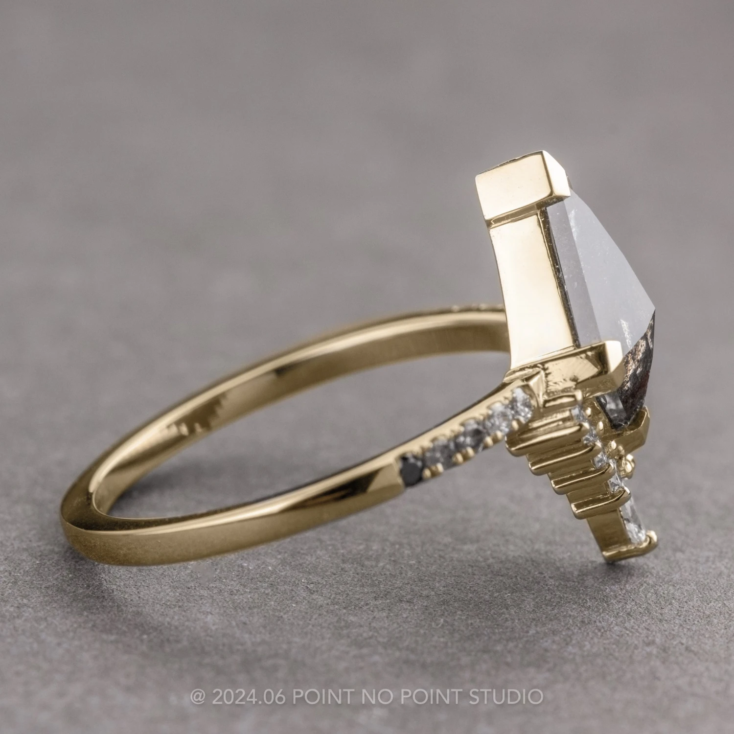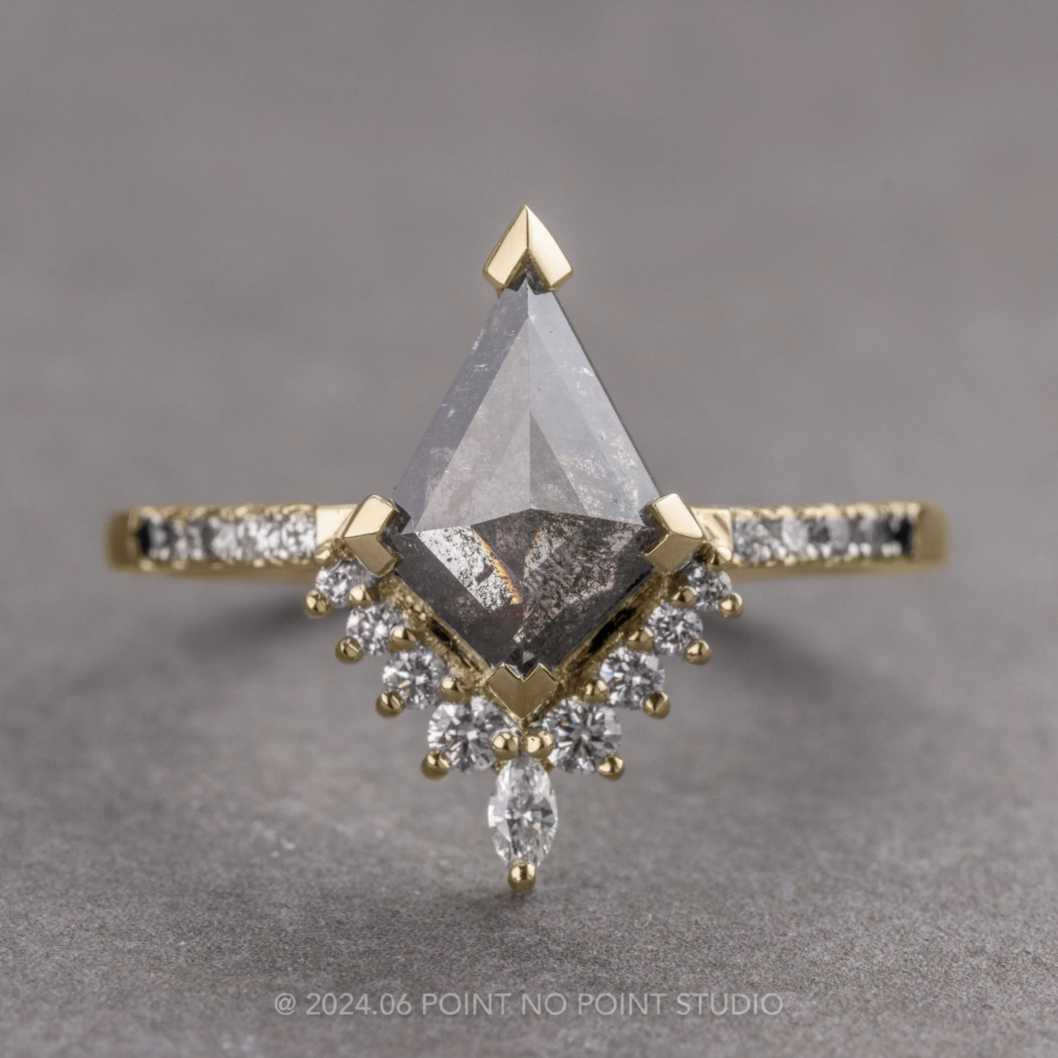 This timeless engagement ring features a striking 1.45 carat black speckled rose cut kite diamond. The diamond is a top quality natural diamond that has not been heated or treated in any way; it is semi-translucent with unique tones and facets that catch the light. The kite sits on top of a half-halo of faceted GHSI white diamonds with the focal point being a sparkly marquise diamond. Each side of the kite diamond has white, grey and black diamonds set into the ring band creating a gradient effect.Â