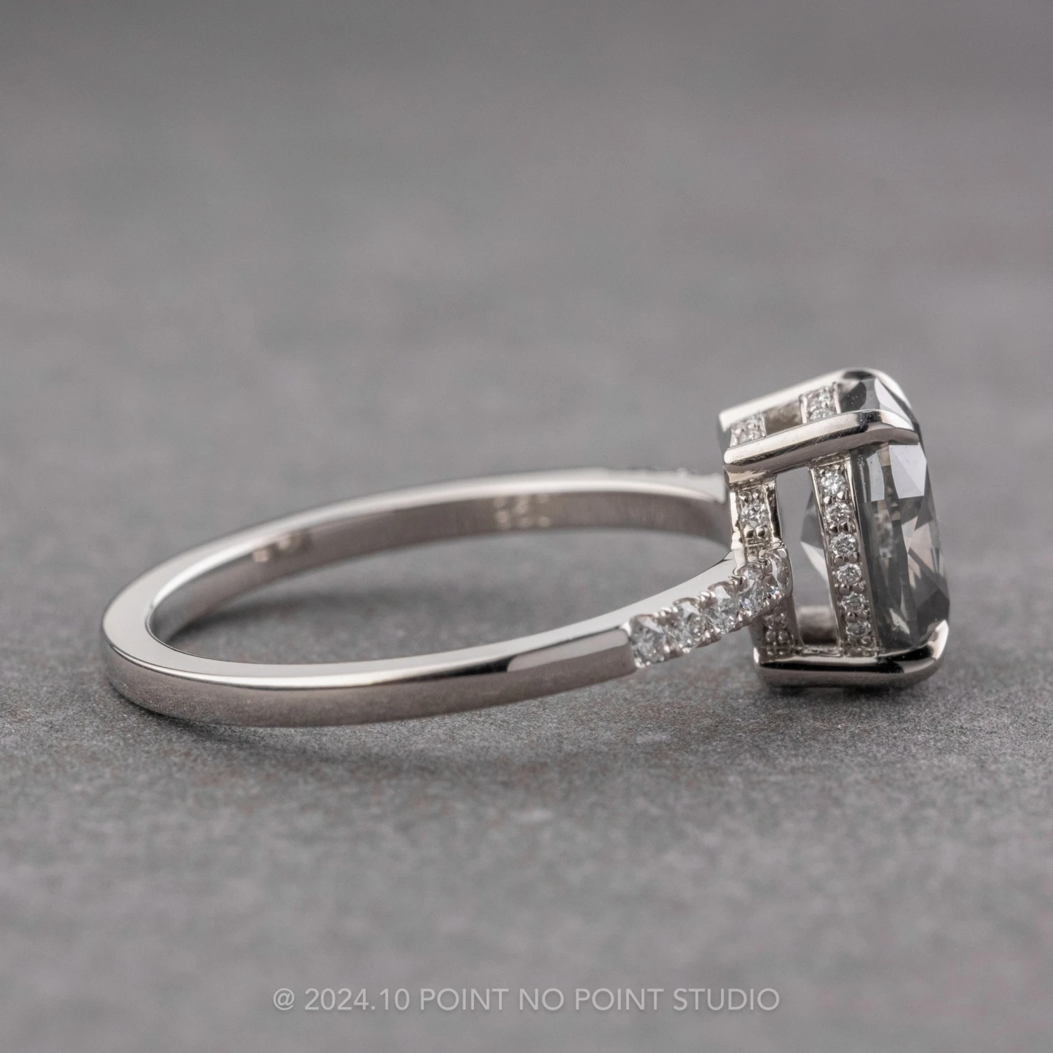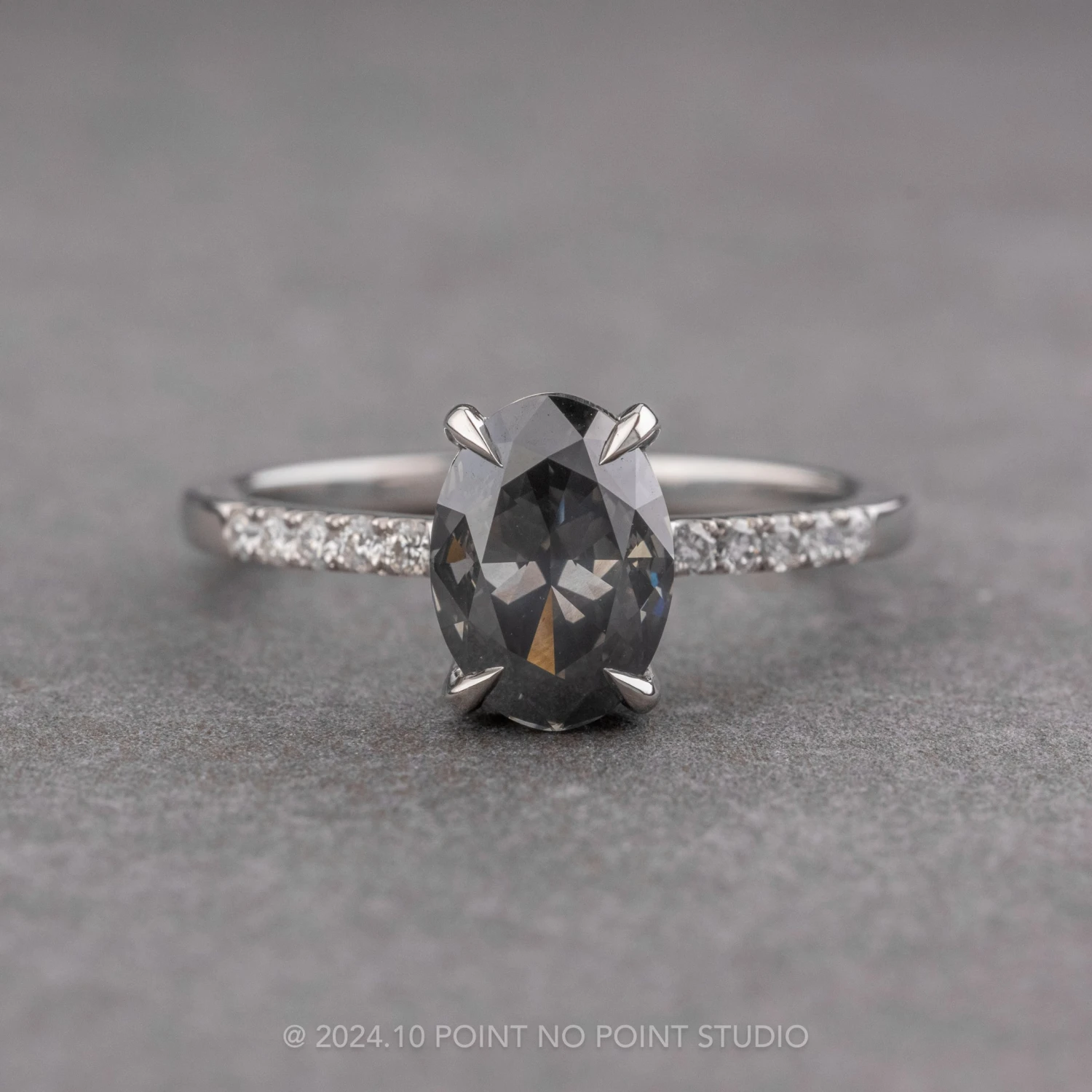 This engagement ring features a gorgeous 1.55 carat fancy grey brilliant cut oval diamond. The diamond is a top quality un-enhanced diamond; it is semi-translucent with unique tones and facets that catch the light. This setting has diamonds micro paved around the center diamond giving the ring an extra hidden sparkle! Down each side of the band are GHSI white brilliant cut diamonds to complete the look.Â