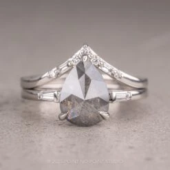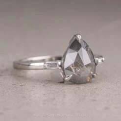 This ring features a beautiful 1.62 carat salt and pepper rose cut pear shaped diamond. The diamond is a top quality, un-enhanced diamond; it is semi translucent with unique tones and facets that catch the light. Set on either side of the center stone are sparkly baguette accent diamonds.