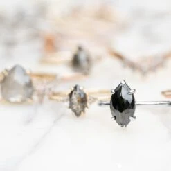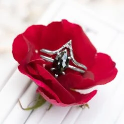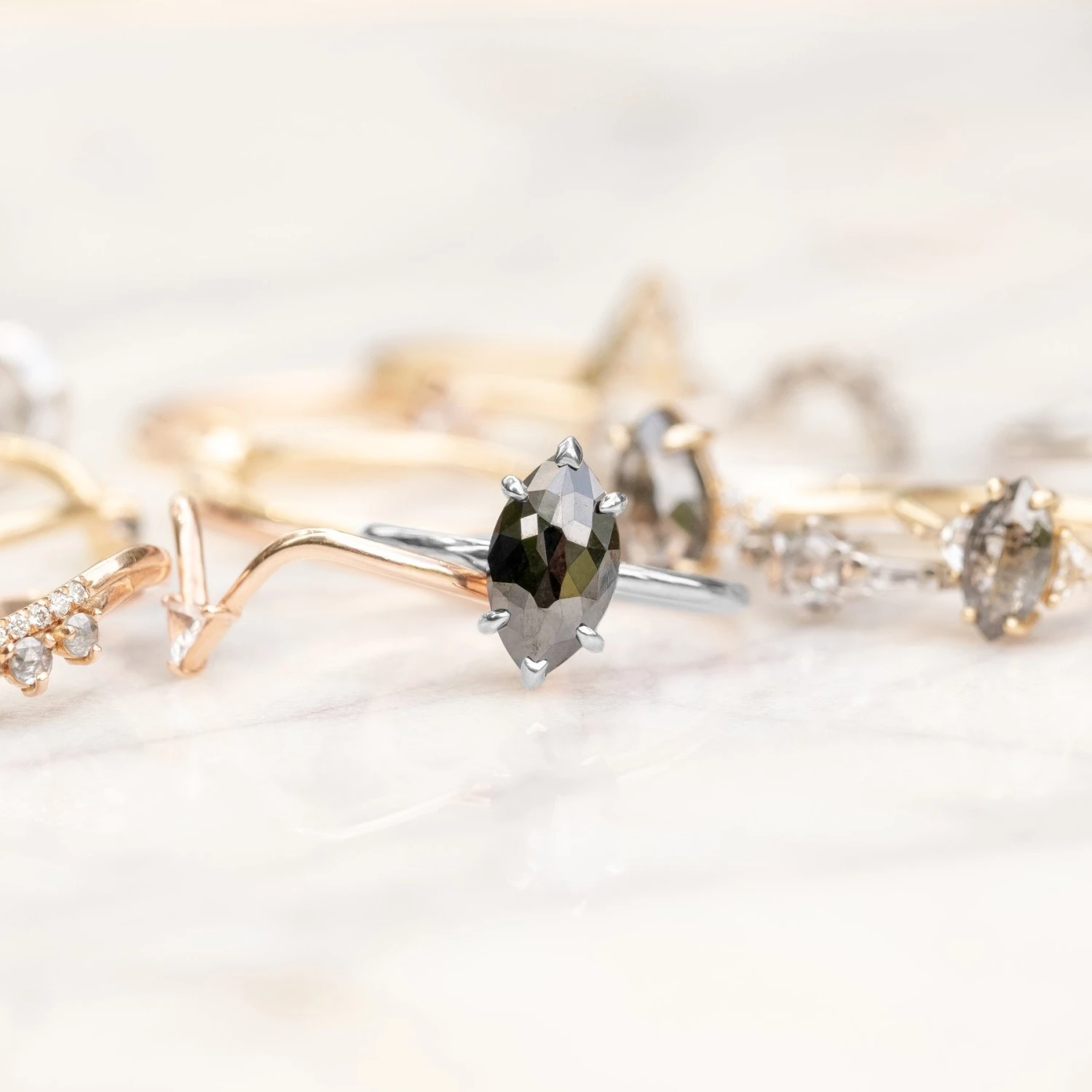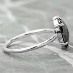 This ring features a stunning natural opaque black rose cut marquise diamond. The hand cut diamond is a top quality natural, black diamond. The marquise diamond has been set in a low profile, 4 prong + 2 chevron cap setting. The entire ring is made out of eco friendly recycled platinum with a round ring band measuring 1.7mm wide.Â