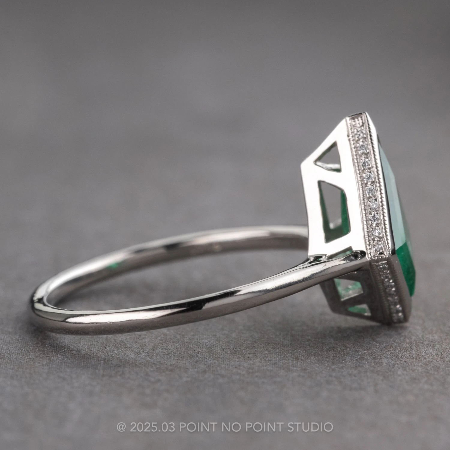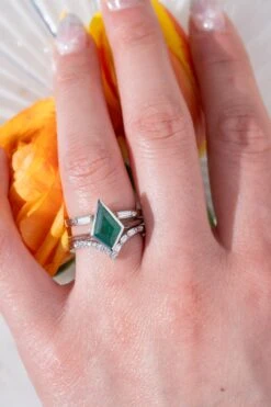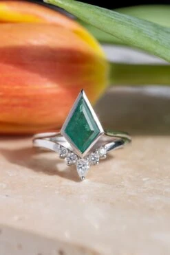 The emerald is set in a sleek raised bezel setting that combines elements of our basket and cathedral settings, showcasing the stone’s unique structure and beautifully highlights its vibrant color. The unique design is further enhanced by diamonds micro-paved around the kite, adding a subtle sparkle! The entire ring is made of eco-friendly recycled platinum with a tapered ring band measuring 1.7mm wide at the widest point.