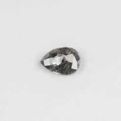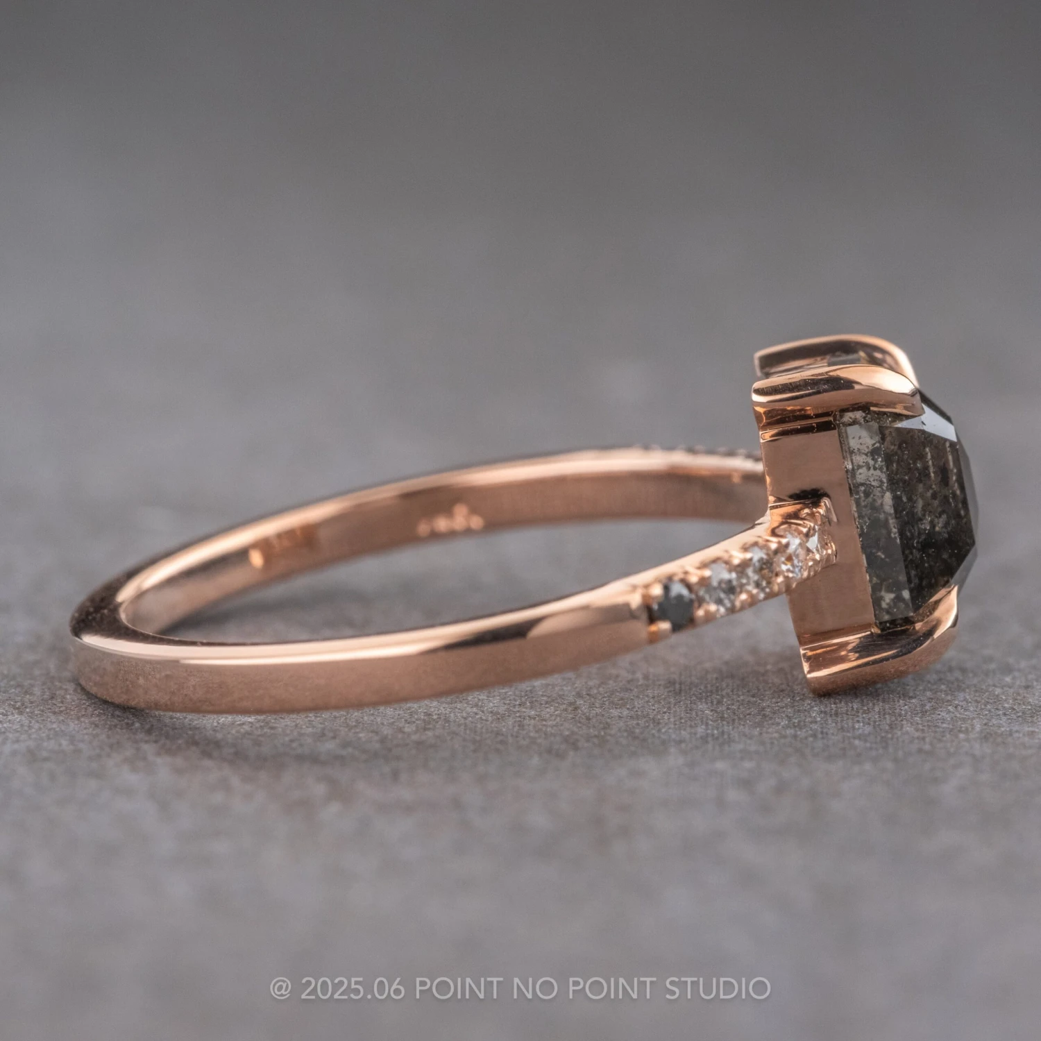 This engagement ring features a mesmerizing and incredibly sparkly 1.62 carat black speckled emerald shaped rose cut diamond. The diamond is a top-quality natural stone, it is semi-translucent with unique tones and facets that catch the light. Flanked on either side by white, grey and black diamonds in the band to create a flawless ombre effect.