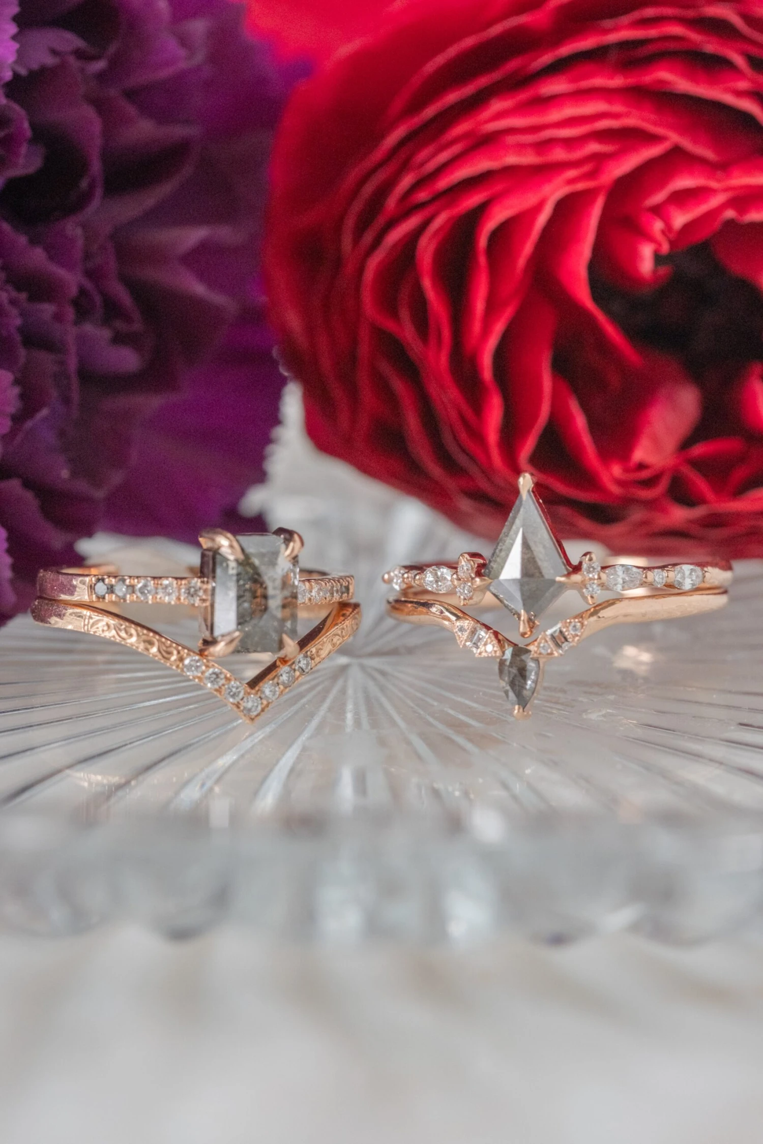 Shown pictured with our Diamond Vintage Vivian and 9 Diamond Vivian wedding bands, sold separately here.Â