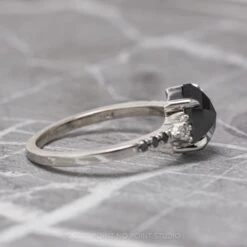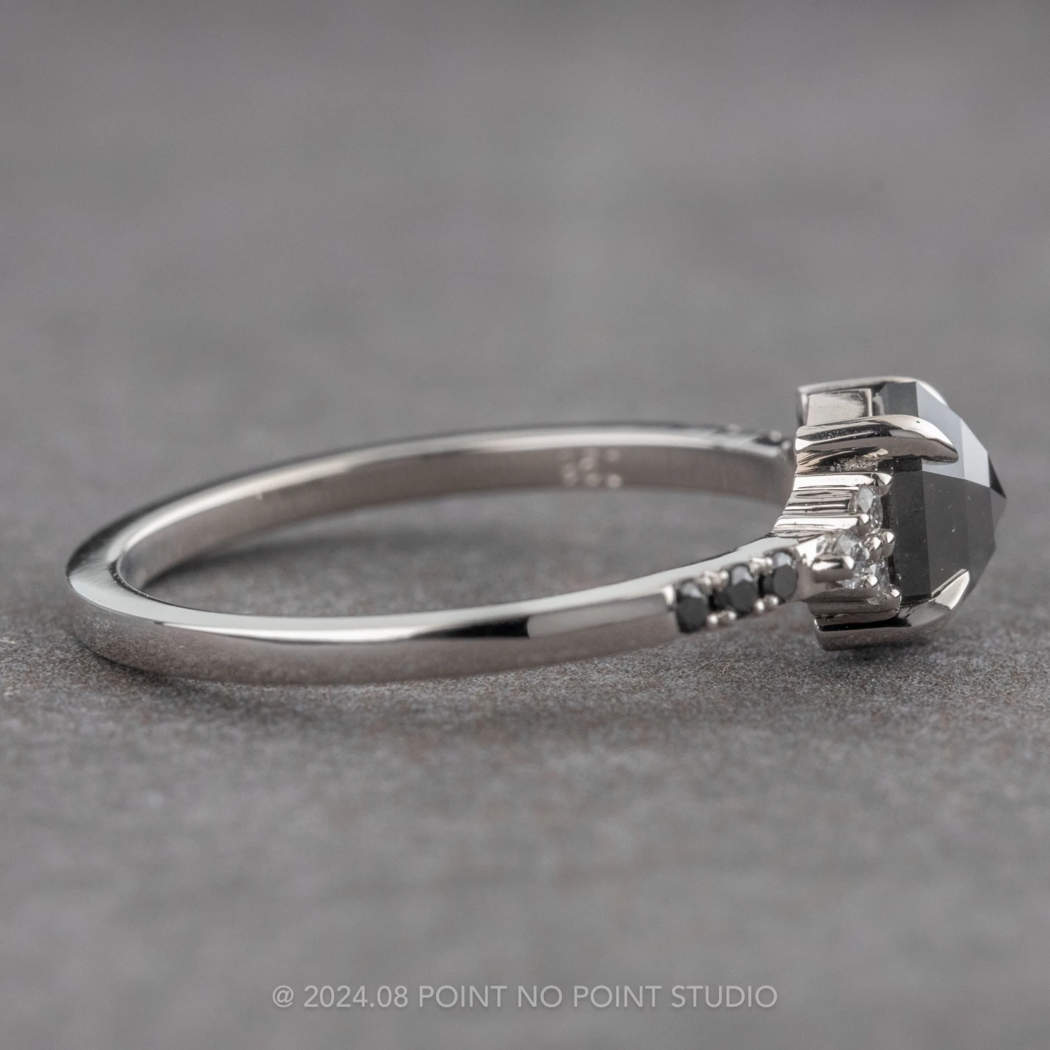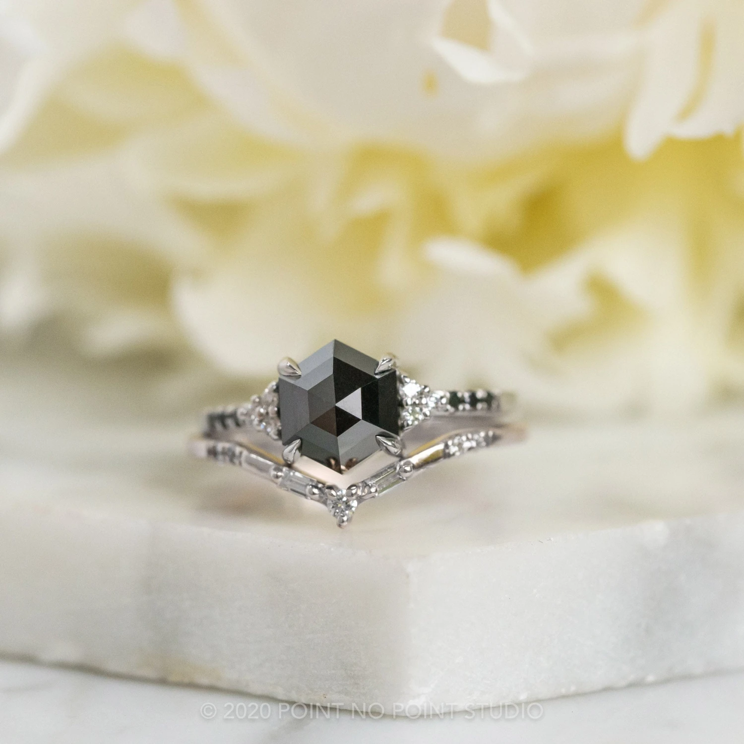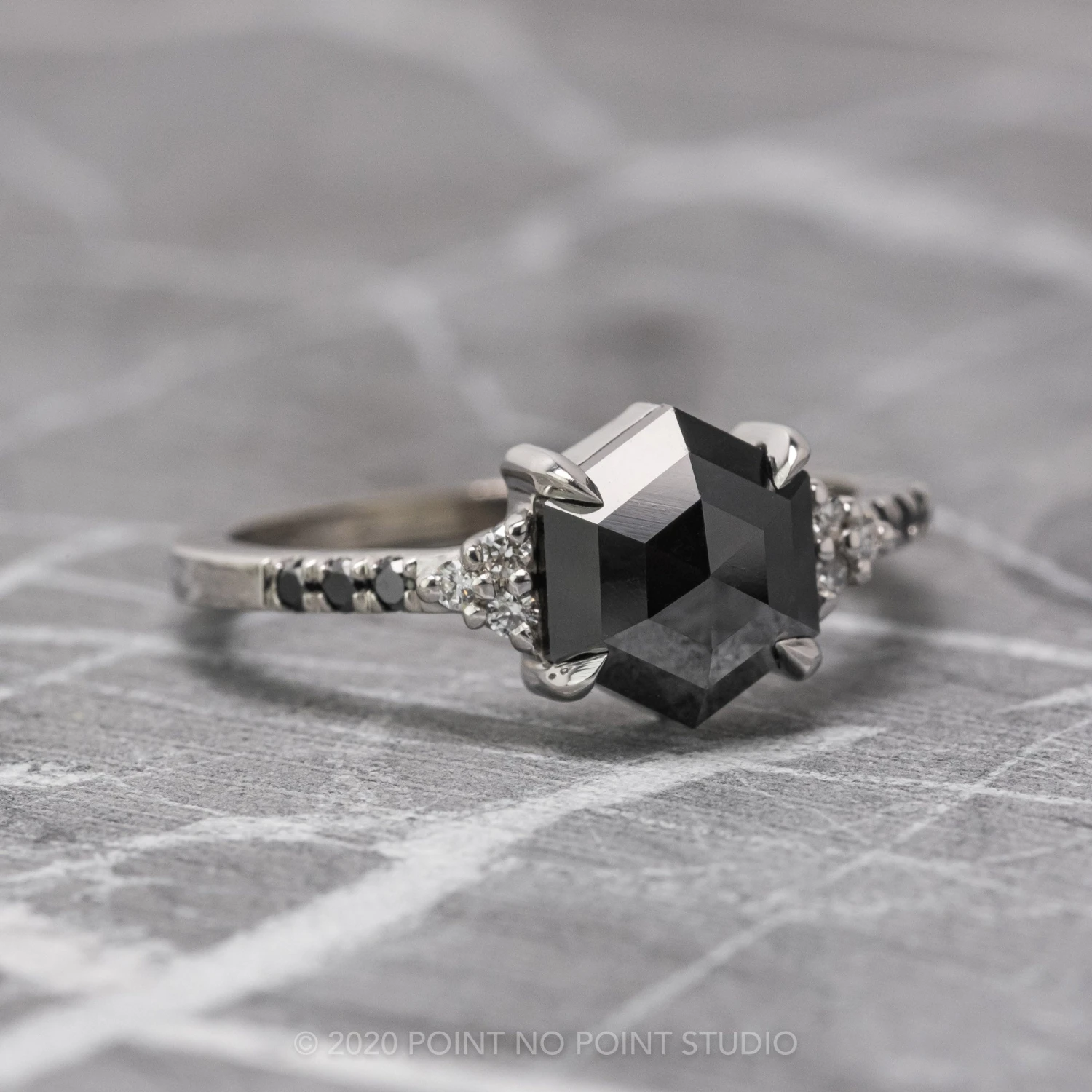 This engagement ring features a gorgeous 1.69 carat opaque black rose cut hexagon diamond. The hexagon diamond is flanked by a cluster of sparkly GHSI white faceted round diamonds, followed by 3 black round diamonds set into the band to complete the look!