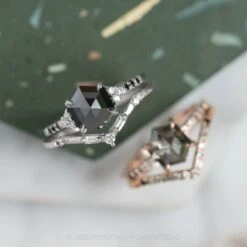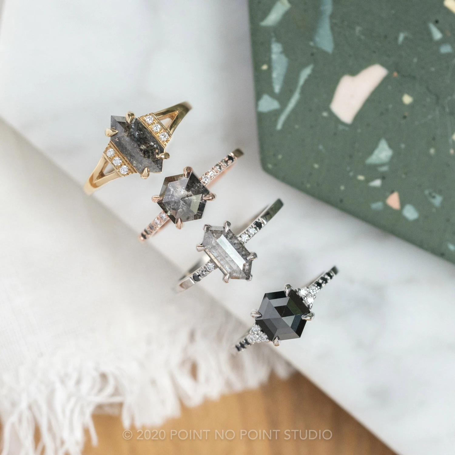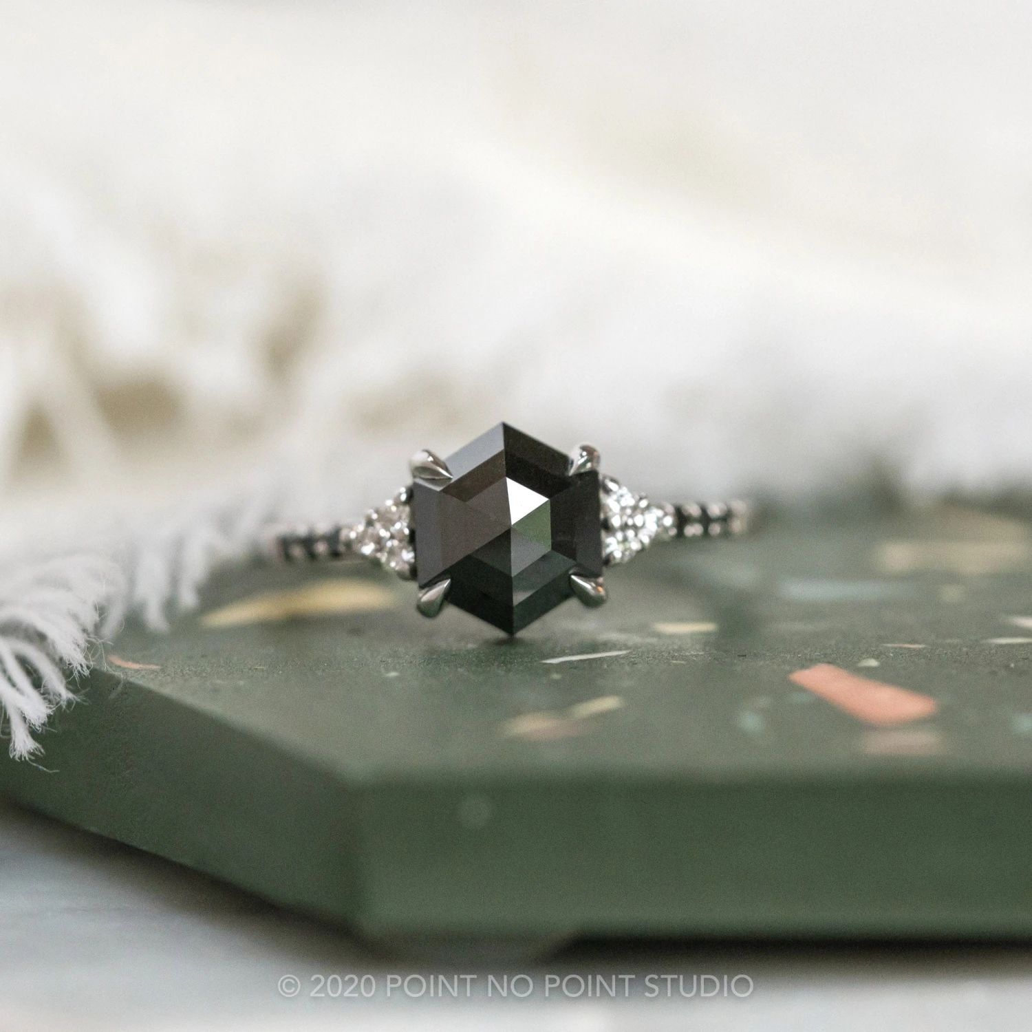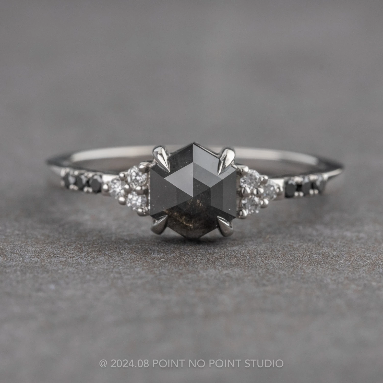This engagement ring features a gorgeous 1.69 carat opaque black rose cut hexagon diamond. The hexagon diamond is flanked by a cluster of sparkly GHSI white faceted round diamonds, followed by 3 black round diamonds set into the band to complete the look!
