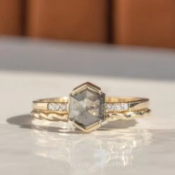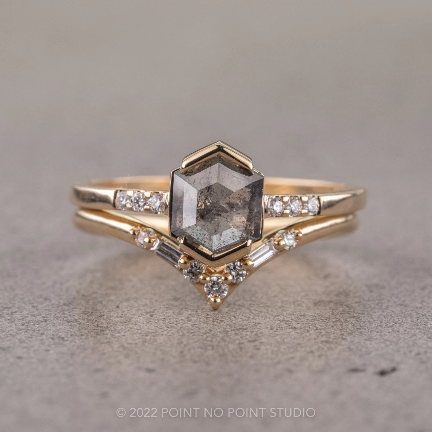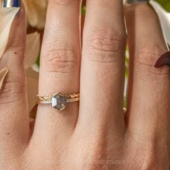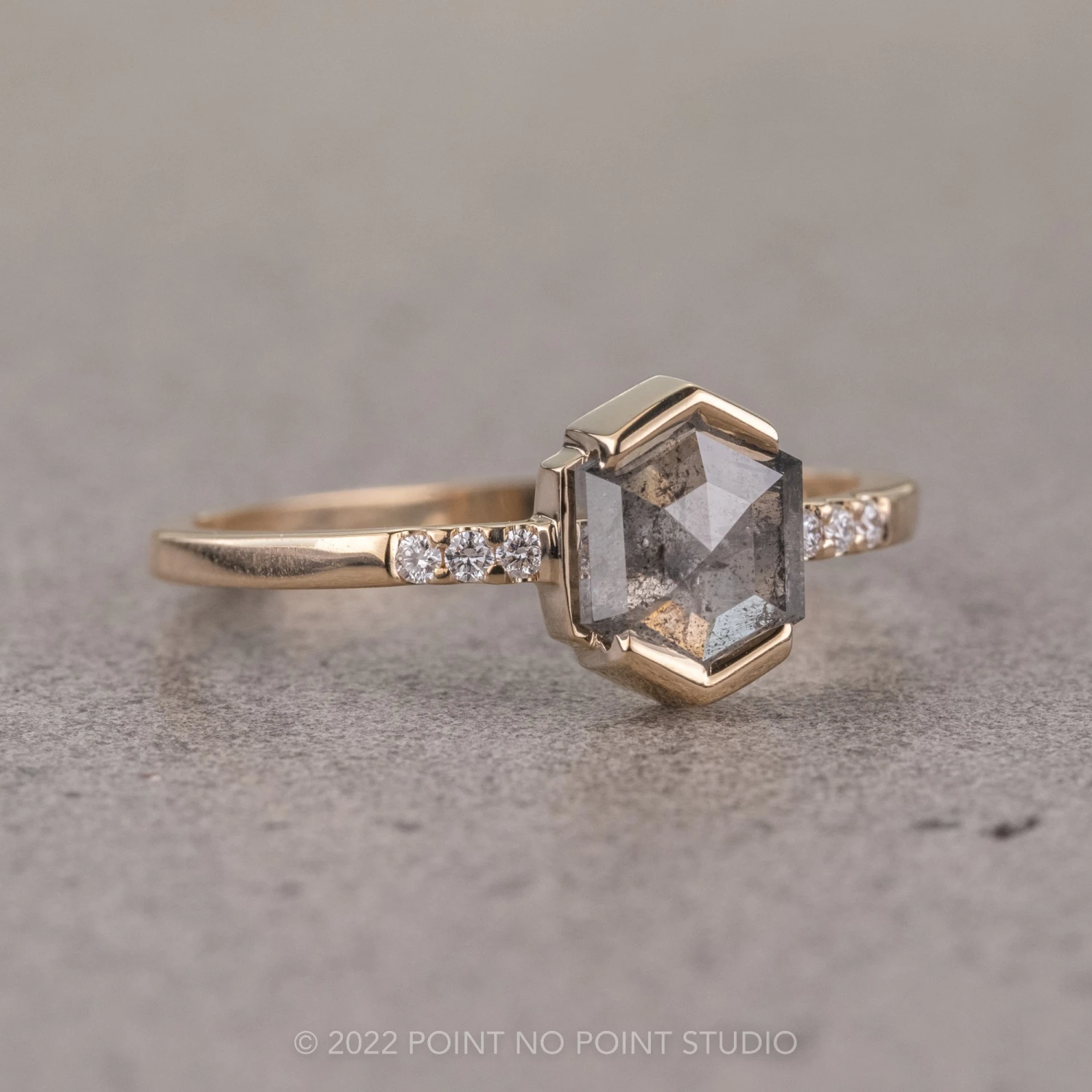 This ring features a beautiful 1.70 carat natural black speckled hexagon shaped diamond. The diamond is a top quality un-enhanced diamond; it is semi-translucent with unique speckling and facets that catch the light. The diamond is set into an open back setting which allows you to see and admire the unique inner structure, tones, and marbling of the diamond.
