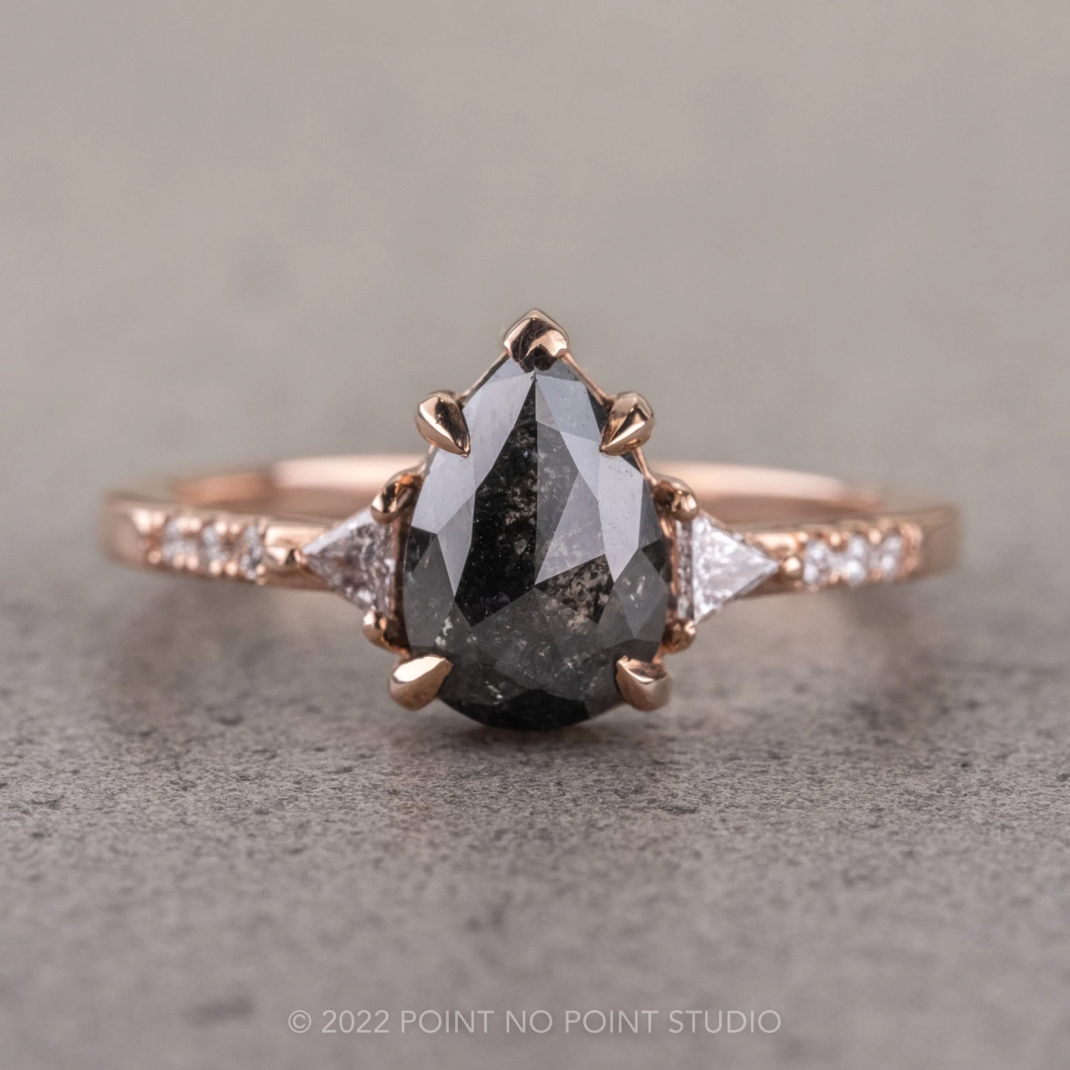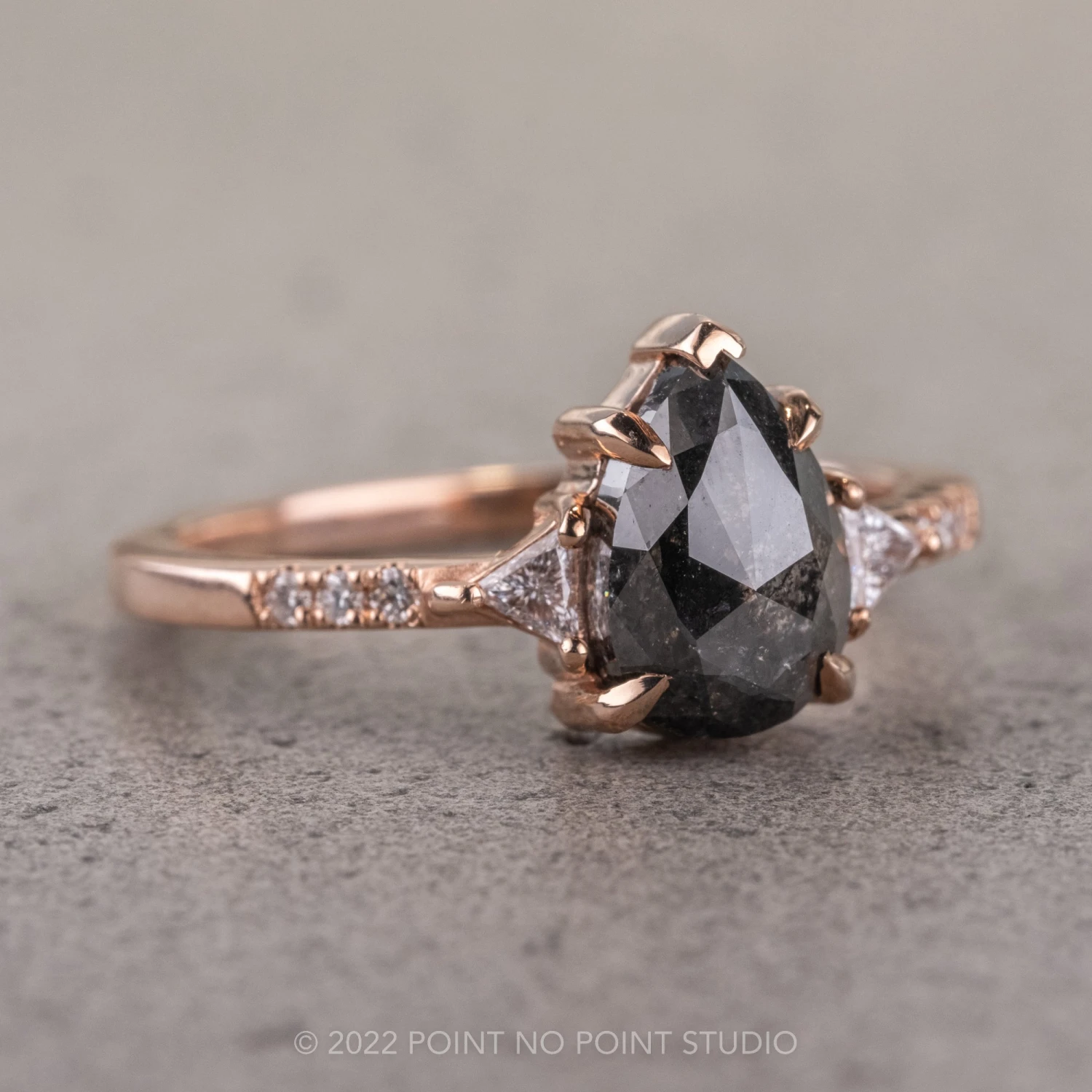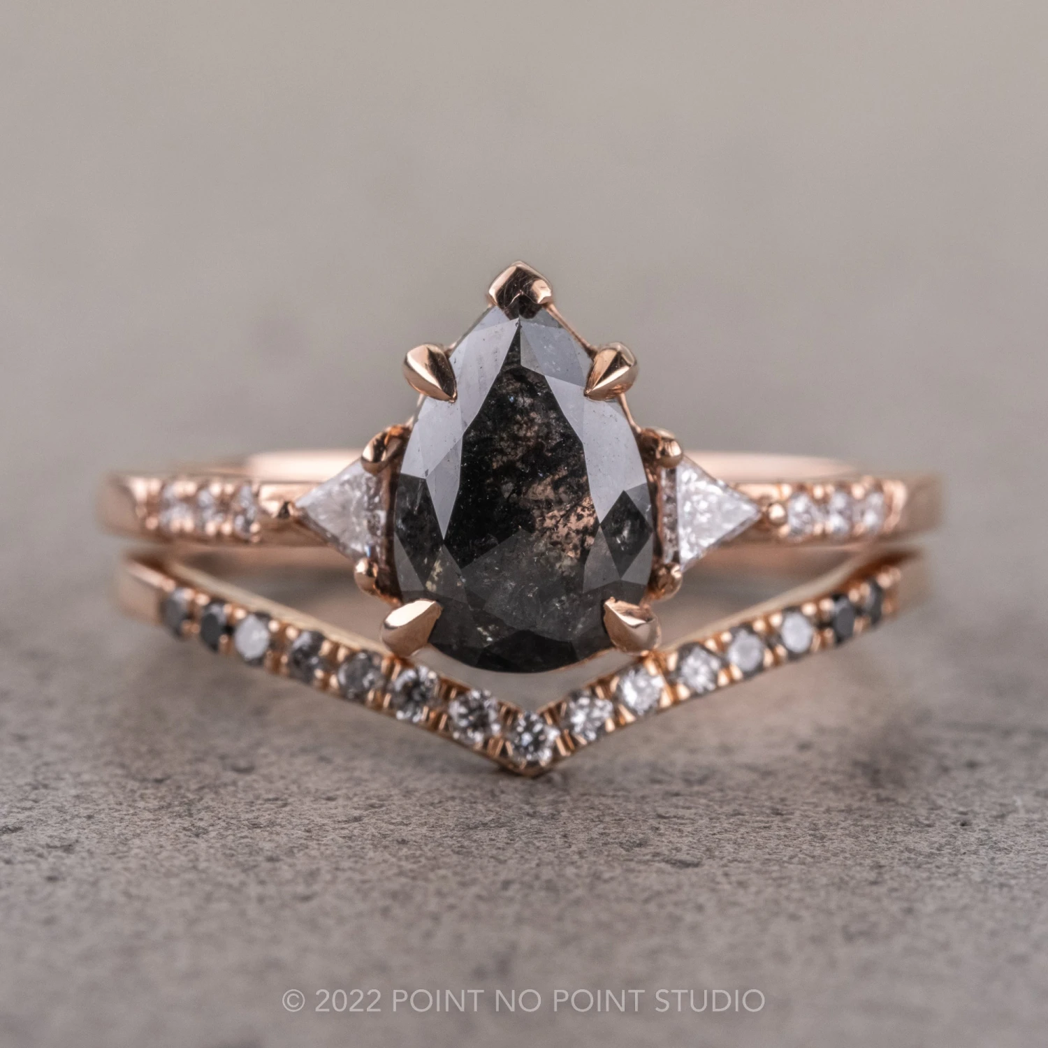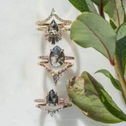 This engagement ring set features a mesmerizing and incredibly sparkly 1.62 carat black speckled pear diamond, flanked on either side by GHSI white triangle shaped accent diamonds, followed by three GHSI white accent diamonds set into the band.Â