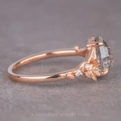 The geometric pear diamond is set into a prong setting that sits directly on the finger. The ring band is 1.7mm round and extremely comfortable to wear. This entire ring setting is made from recycled 14k rose gold and is finished with asymmetrical hand engraved leaf details.
