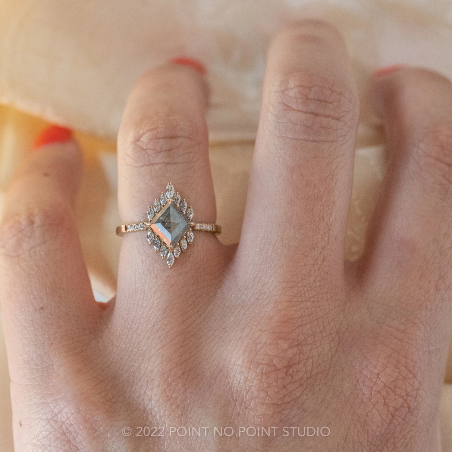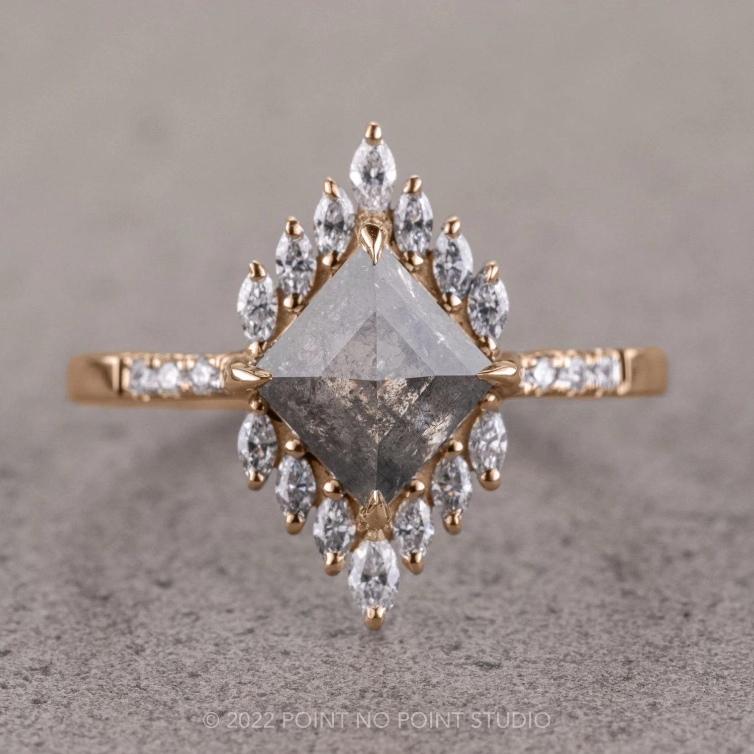 This modern and vintage-like engagement ring is our spin on a timeless stunner – featuring a striking 1.40 carat salt and pepper lozenge rose cut diamond with super unique inner marbling and semi-translucency.Ā The diamond is a top-quality all-natural stone that has not been heat treated or enhanced in any way!Ā