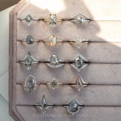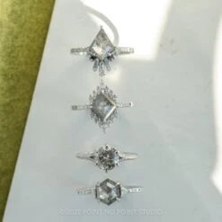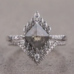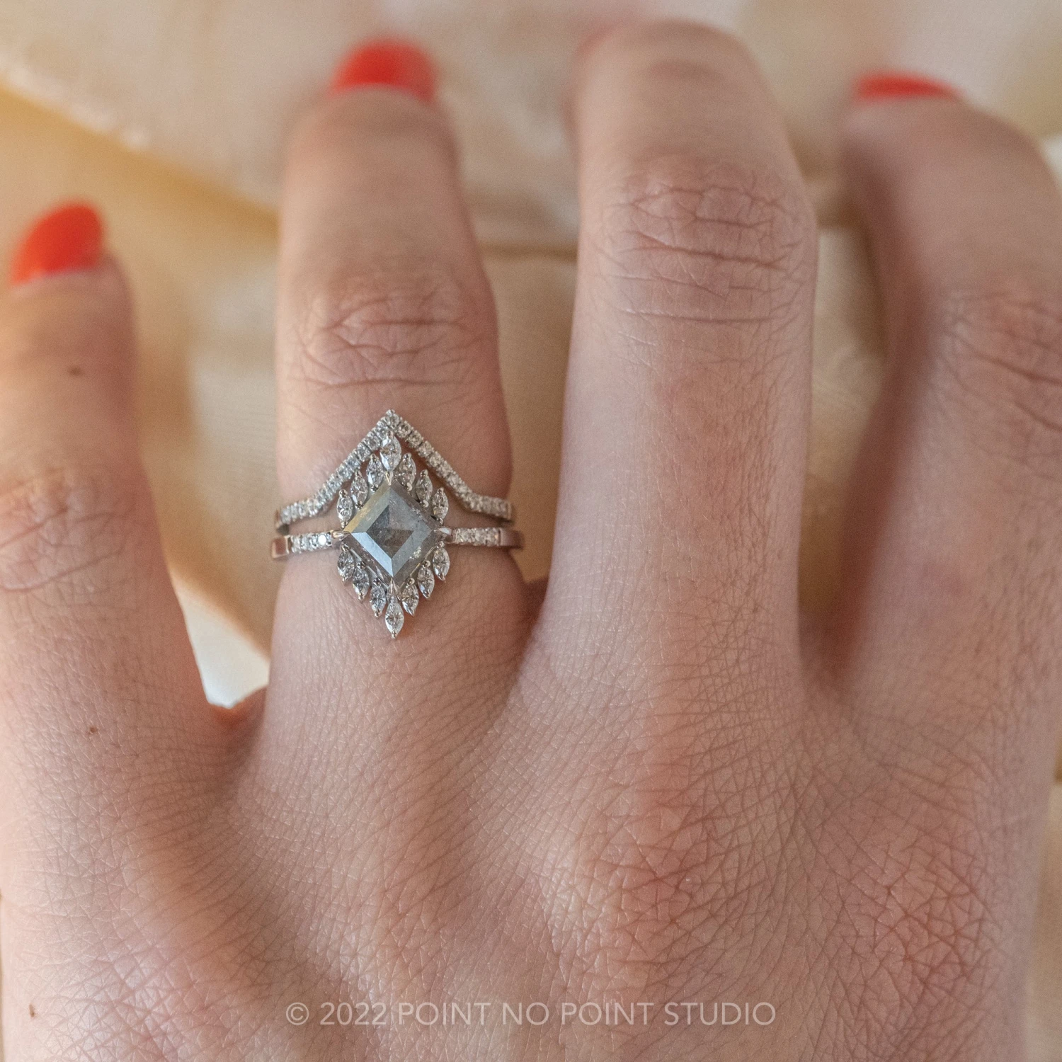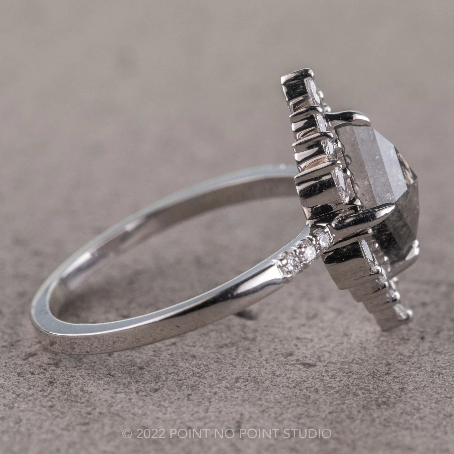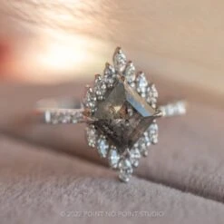 This modern and vintage-like engagement ring is our spin on a timeless stunner – featuring a striking 1.40 carat salt and pepper lozenge rose cut diamond with super unique inner marbling and semi-translucency. The diamond is a top-quality all-natural stone that has not been heat treated or enhanced in any way!Â