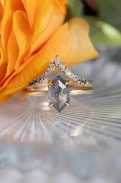 This engagement ring features a stunning 1.80 carat hexagon shaped rose cut diamond. The diamond is a top quality all-natural diamond that is not heat treated or enhanced in anyway – it it naturally semi-translucent with unique inner black speckling. Â