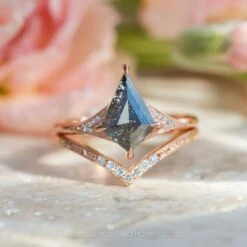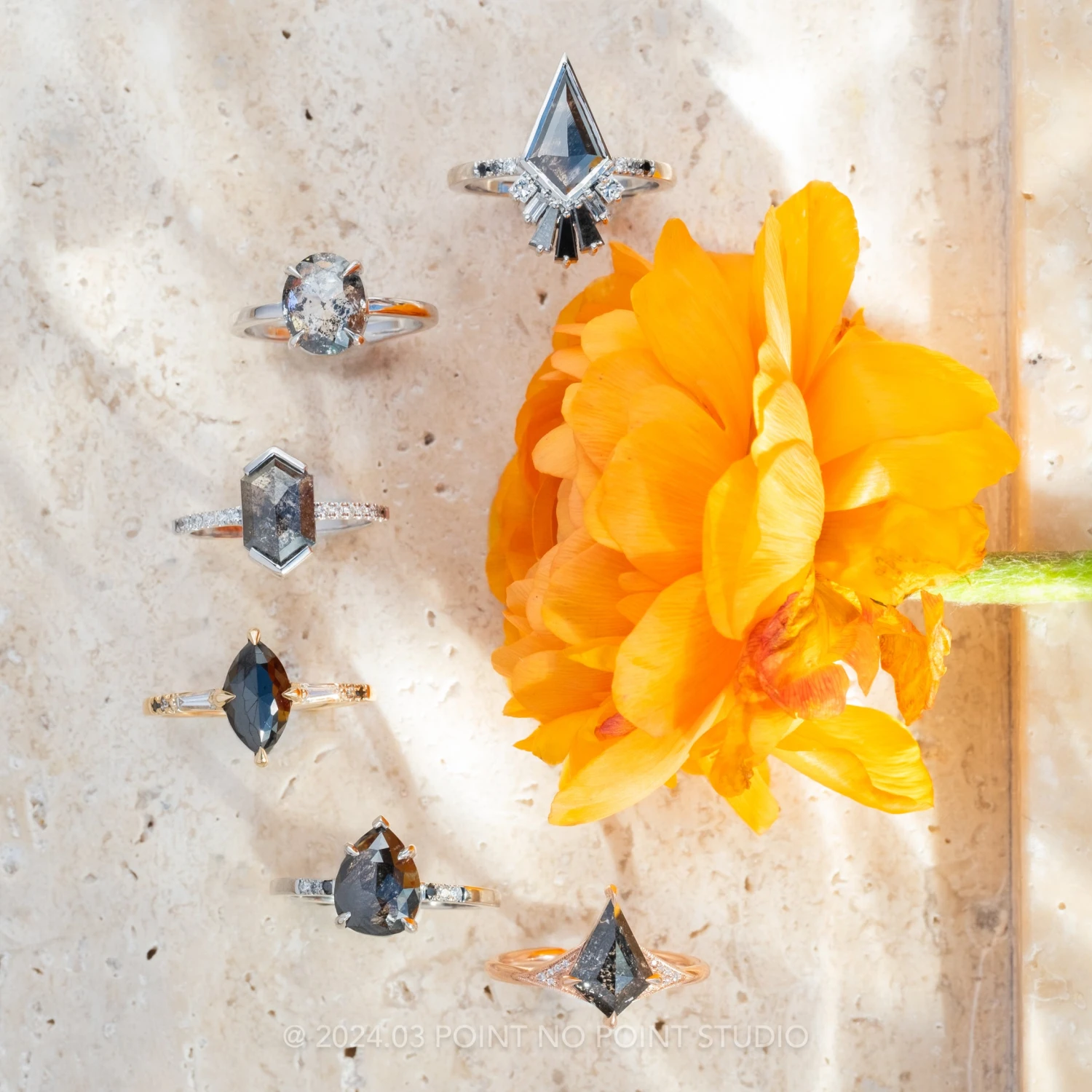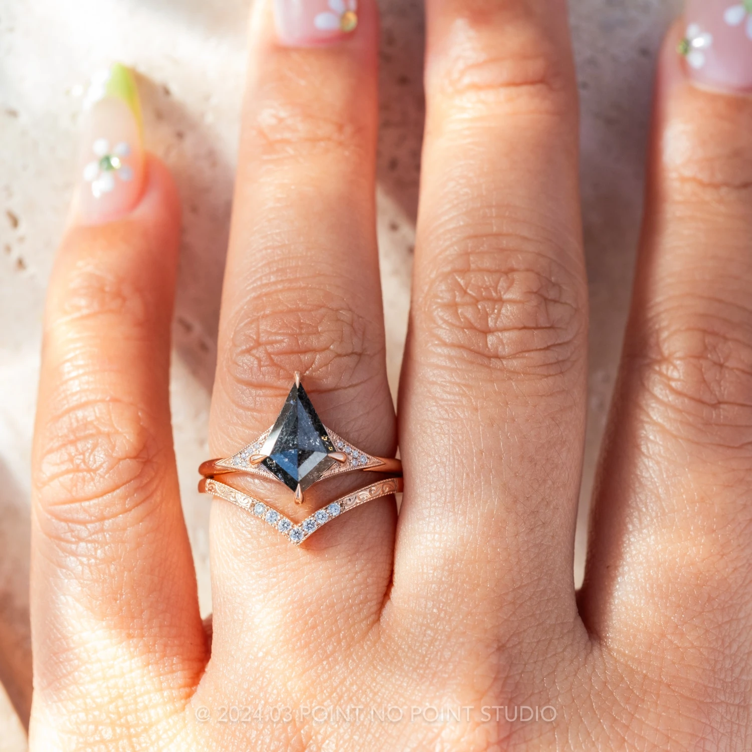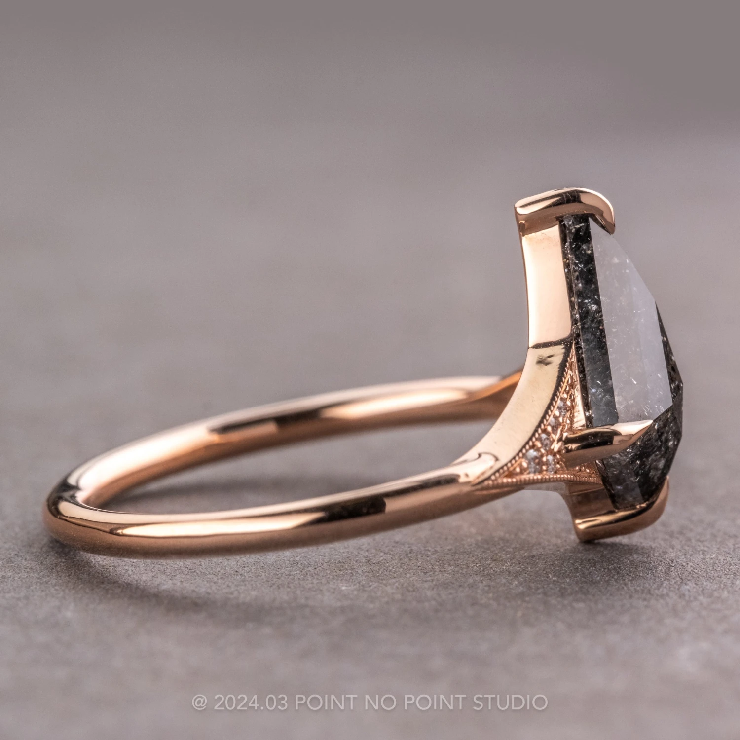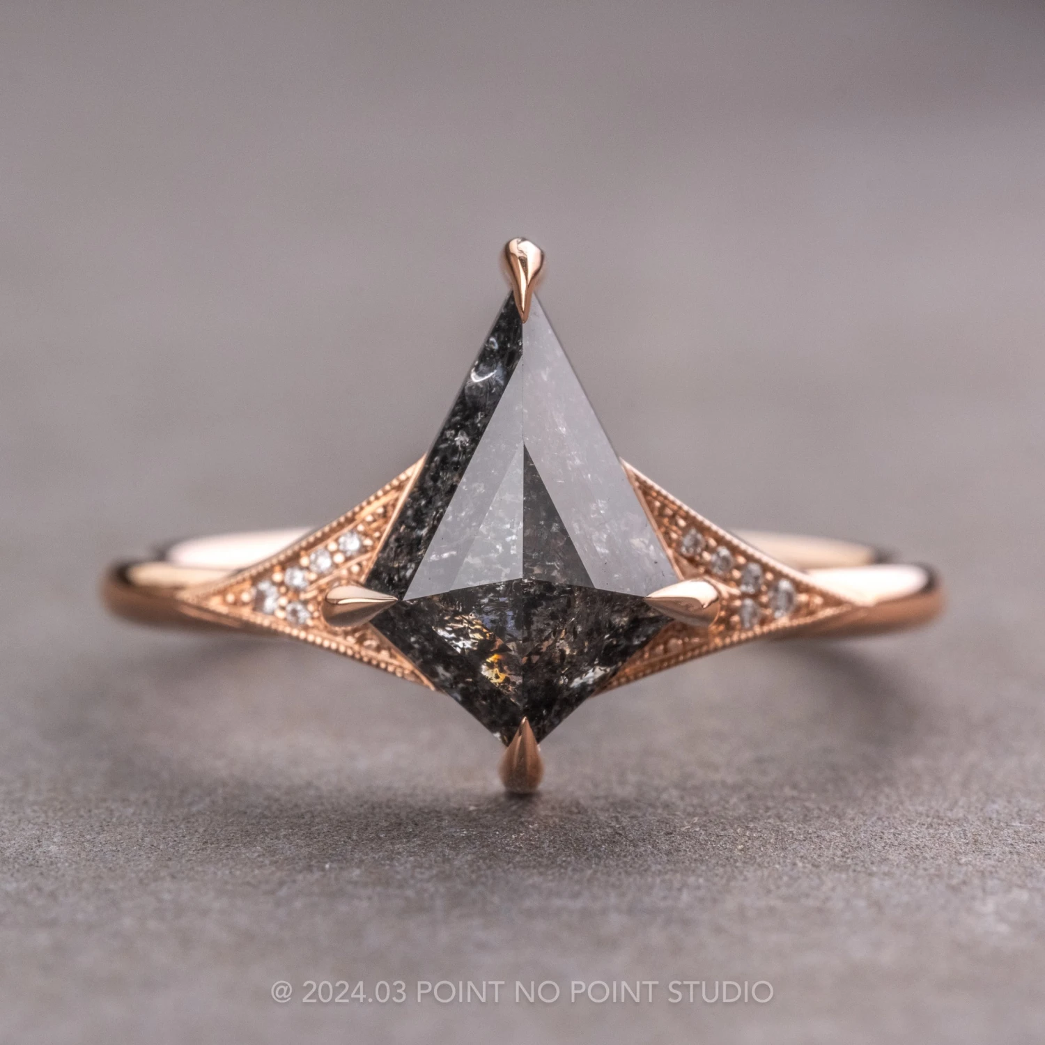 This magical ring features a stunning 1.81 carat black speckled kite diamond – the hand cut diamond is a top quality natural, non enhanced or treated diamond. The diamond is set into an open back setting to allow the light to shine through the diamond. The setting around the GHSI white accent diamonds has hand engraved milgrain.Â