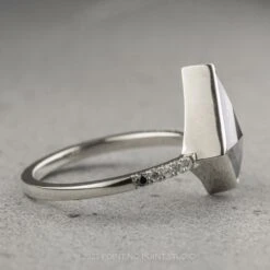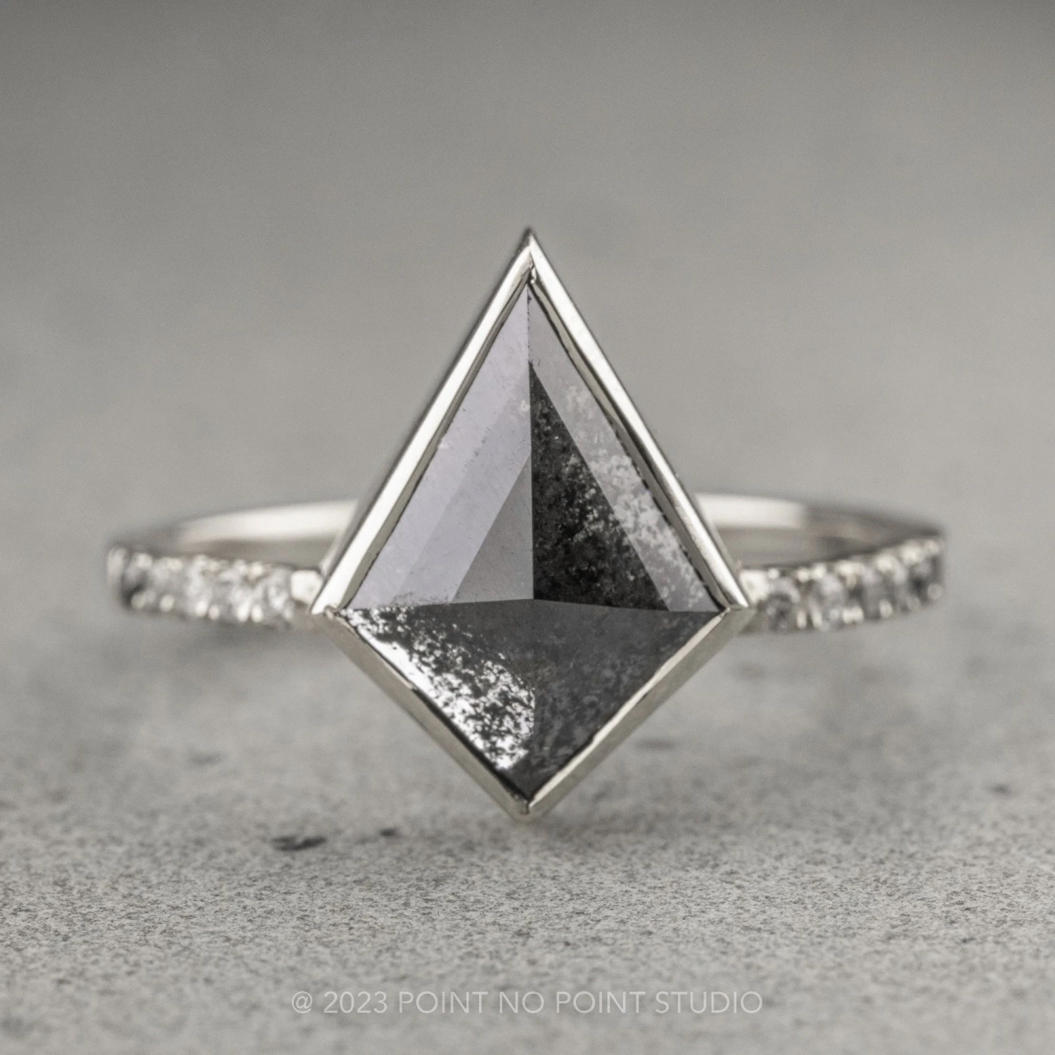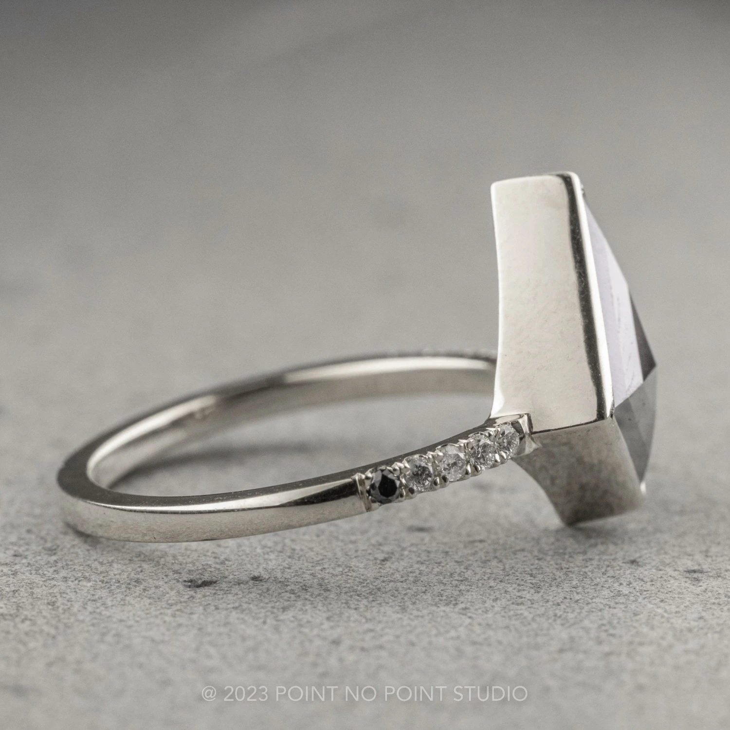 This engagement ring features a mesmerizing 1.74 carat black speckled kite shaped diamond. This top-quality and all-natural stone is un-enhanced or heat treated; it is semi-translucent with unique tones and facets that catch the light. Flanked on either side by 5 ombre round accent diamonds down each side of the band.