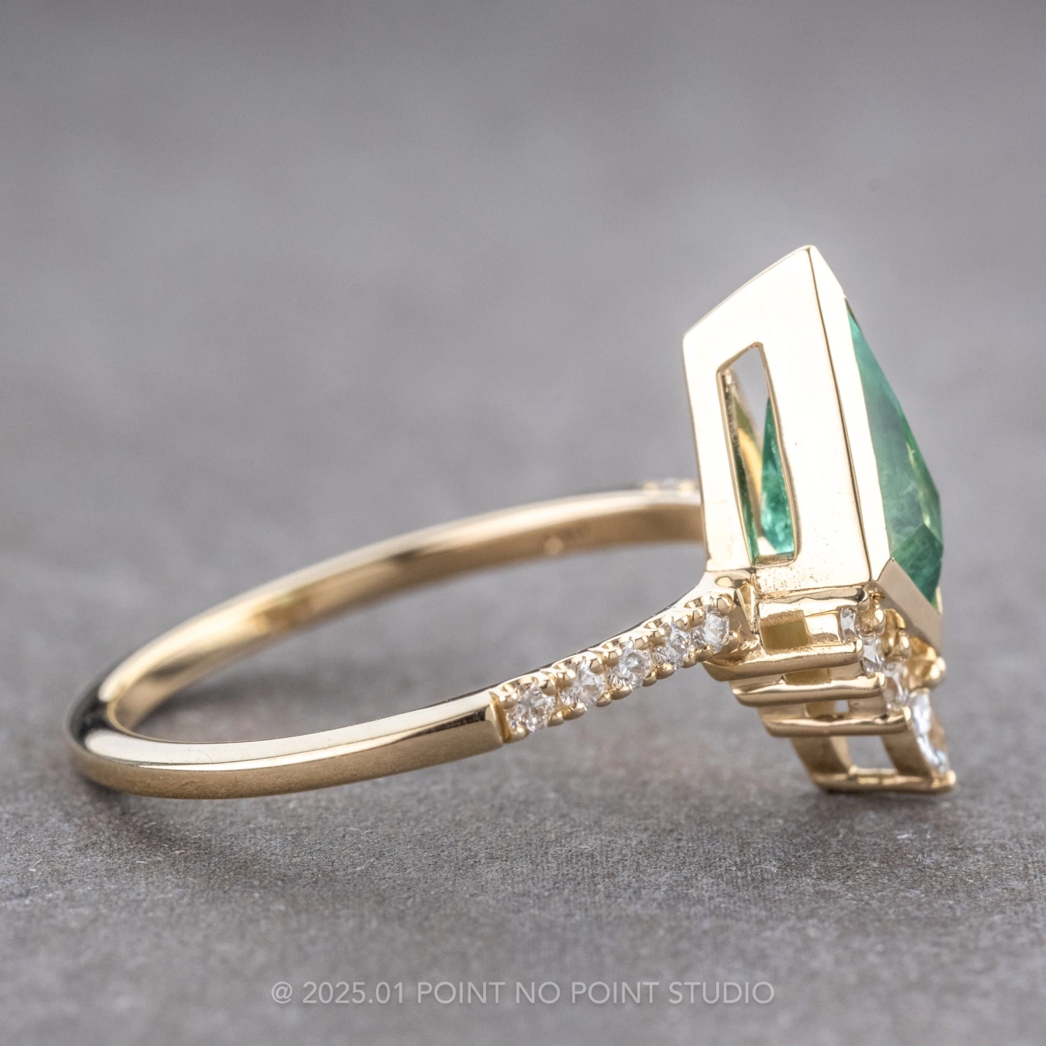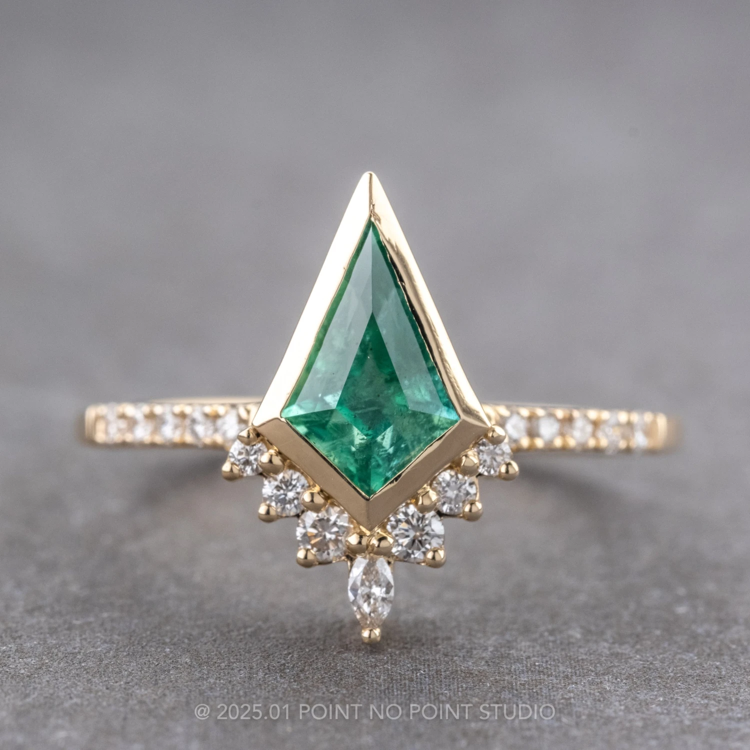 This timeless engagement ring showcases a striking 1.62 carat brilliant cut kite shaped emerald, a top-quality, natural stone that has not been heated or treated in any way. Natural kite shaped emeralds are extremely rare, making this ring truly one-of-a-kind!
