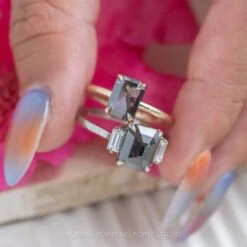 This ring features a gorgeous 1.54 carat all-natural black speckled asscher shaped diamond. The diamond is a top quality un-enhanced diamond; it is semi-translucent with unique speckling and facets that catch the light. Set on either side of the diamond is a beautiful GHSI white baguette diamond to complete the look!
