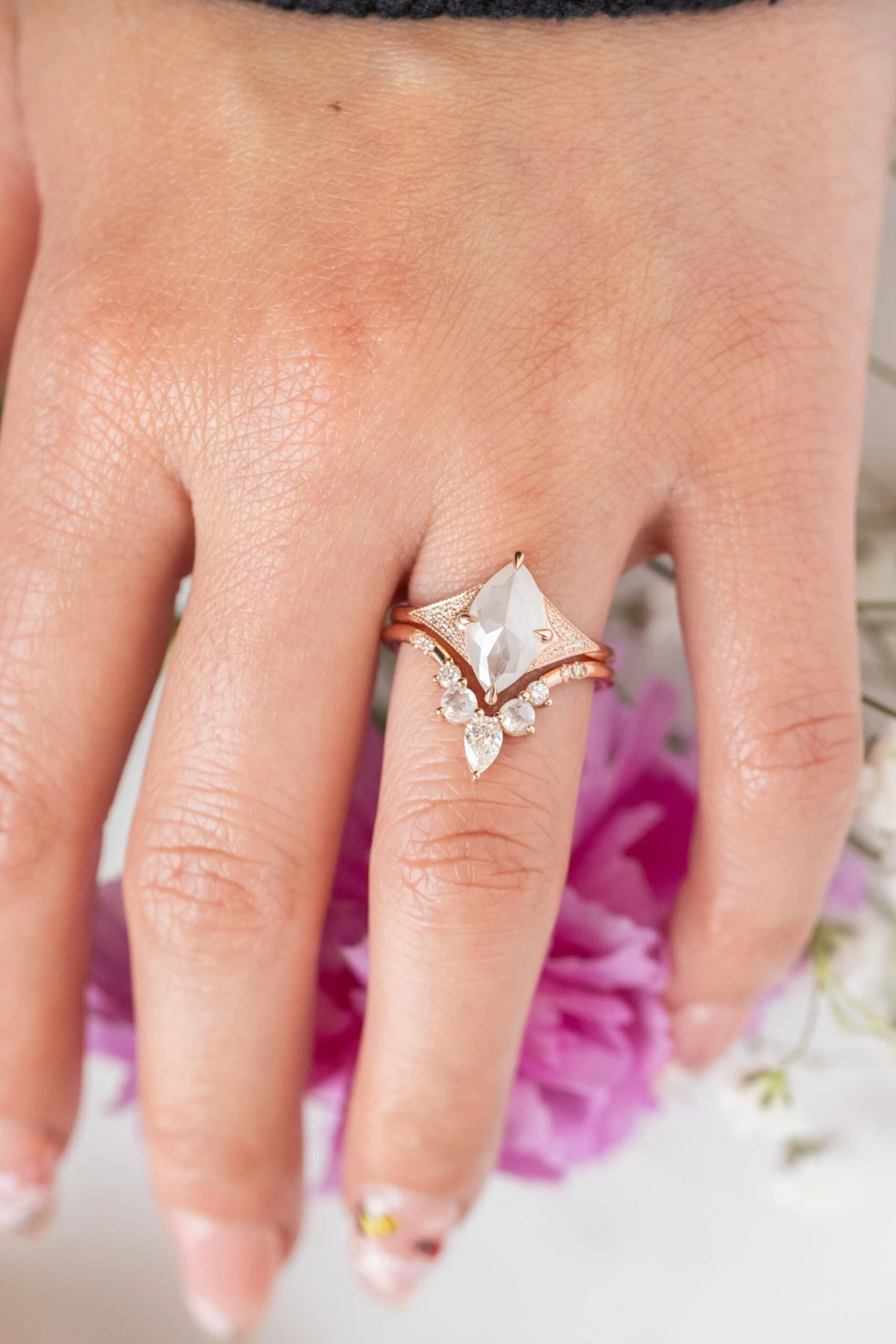 Wedding Rings: This engagement ring can be stacked with ANY of our hundreds of wedding ring options, we use the same engagement ring CAD measurements to build the wedding ring around it to ensure a great stacking set.Â