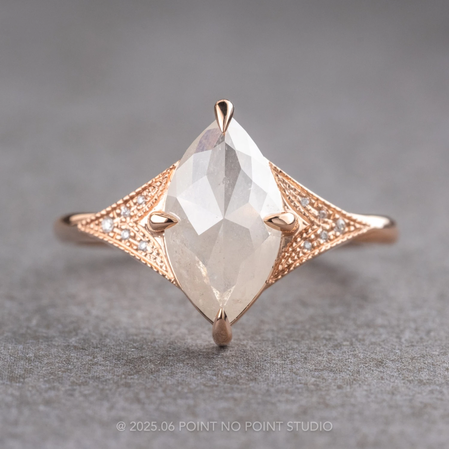 This magical ring features a stunning 1.87 carat icy white marquise shaped diamond – the hand cut diamond is a top quality natural, non enhanced or treated diamond. The rose cut diamond is set into an open back setting to allow the light to shine through the diamond. The setting around the GHSI white accent diamonds has intricate hand engraved milgrain to complete the look!