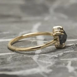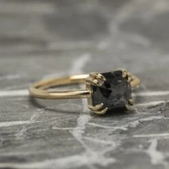 This unique and modern ring features a beautiful 1.90 carat natural black speckled double cut asscher diamond. The diamond is a top quality un-enhanced diamond; it is semi-translucent with unique speckling and facets that catch the light. The back of the setting is open to allow light into the diamond and to enhance its natural sparkle.