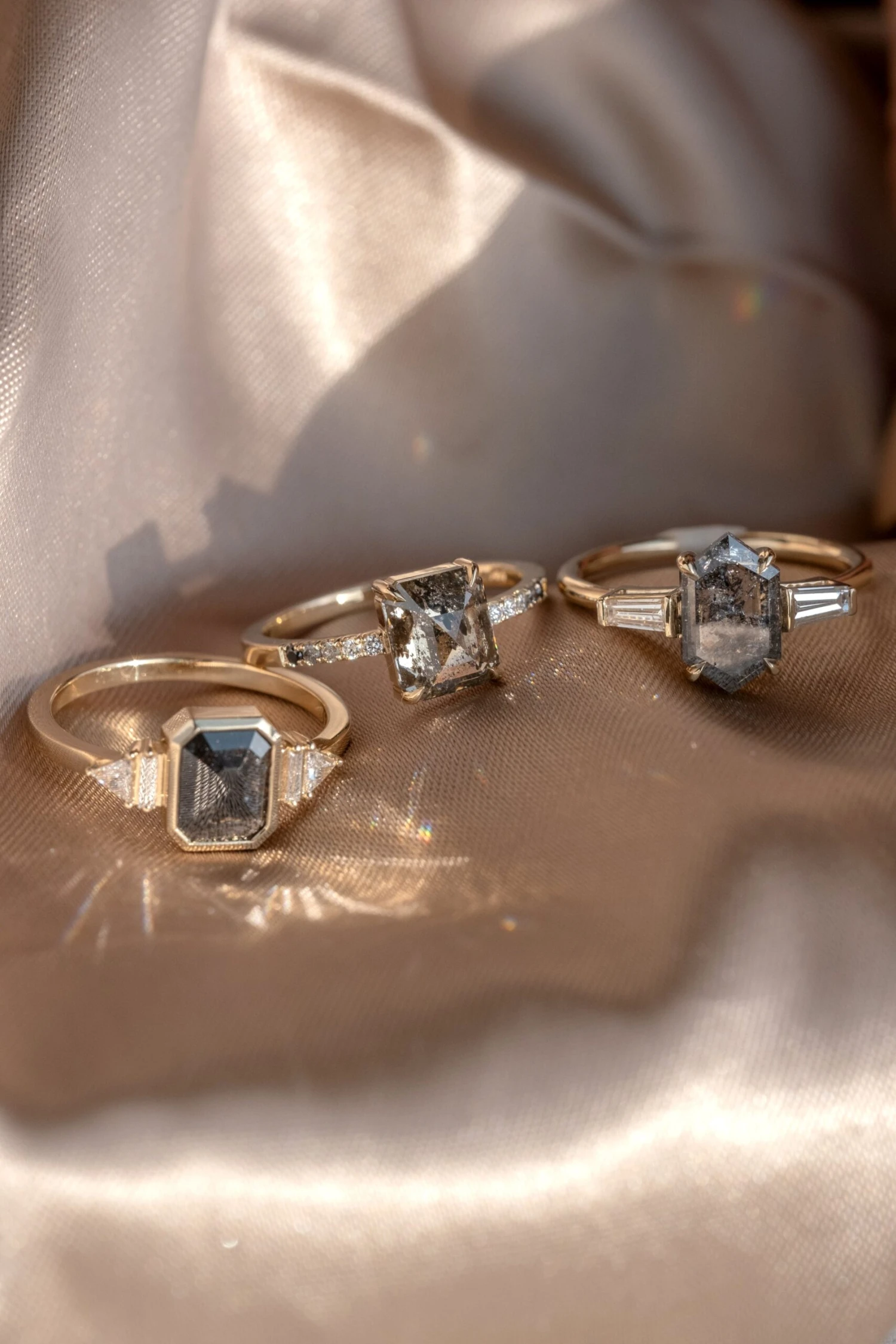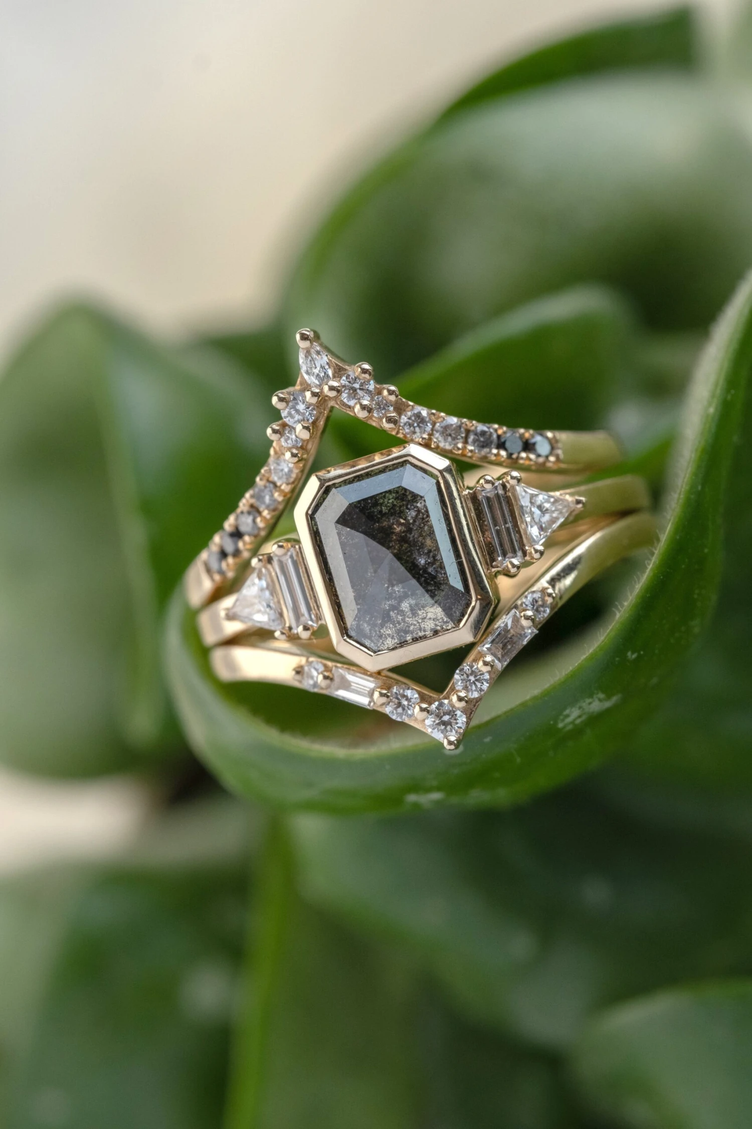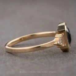 This unique and modern ring features a beautiful 1.78 carat black speckled rose cut emerald shaped diamond. The diamond is a top quality un-enhanced diamond; it is semi-translucent with unique tones and facets that catch the light. Set on either side of the diamond are beautiful GHSI white baguette diamonds accentuated by GHSI white triangle diamonds.Â