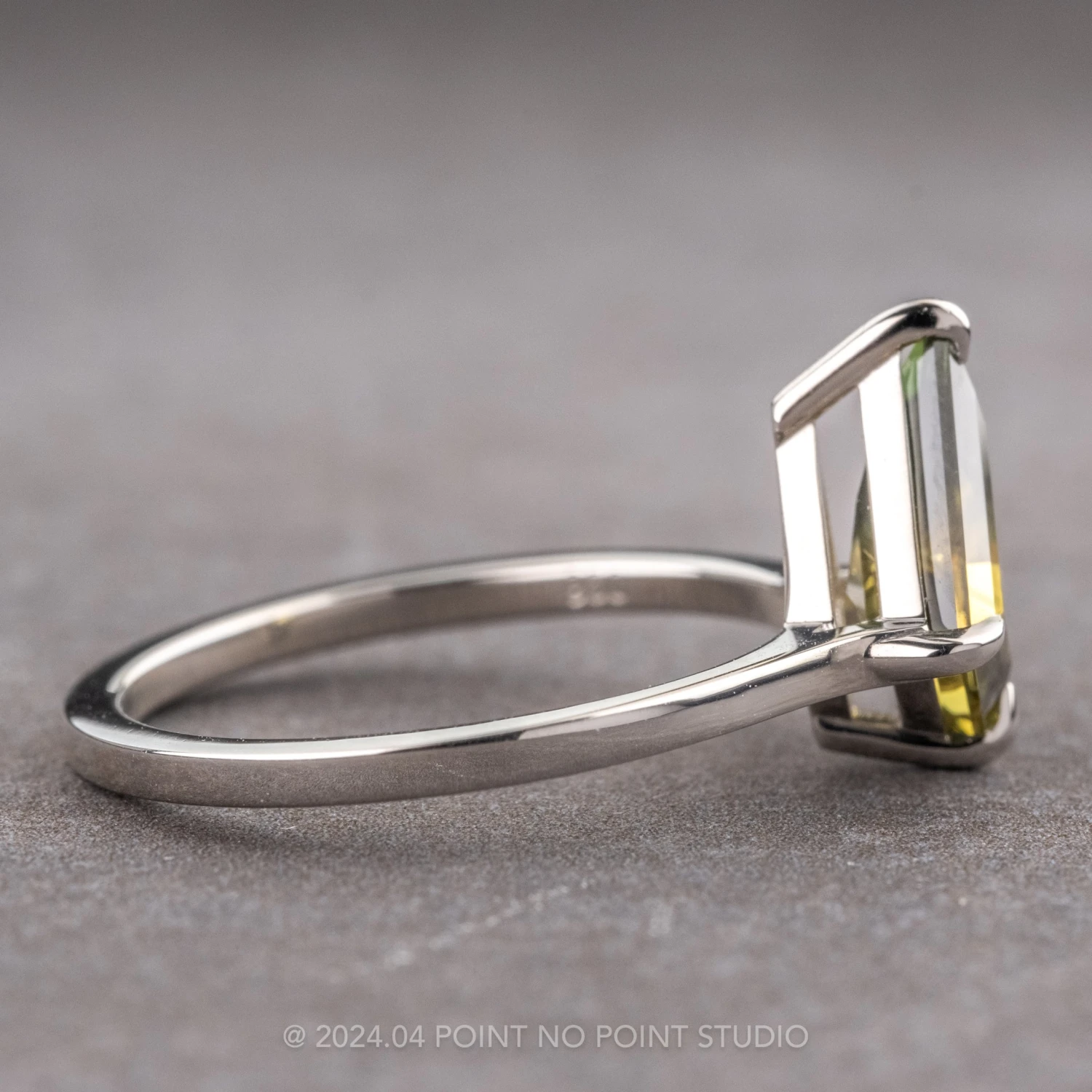 The ring features a gorgeous 1.95 carat brilliant cut parti kite sapphire that ranges in tone from yellow to teal. The Australian sapphire is a natural stone that has not been treated or heated in any way. The entire ring is made of eco-friendly recycled platinum. The band is 1.7mm wide and is very comfortable to wear. The stone sits in a slightly elevated basket and is secured by 4 prongs.