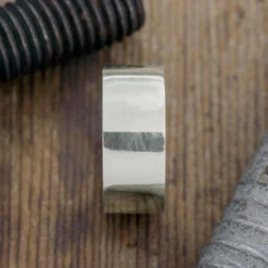 This ring is made of solid recycled eco friendly 14k recycled white gold. The band is so simple and traditional. The entirety of the ring has been given a high polished finish.Â