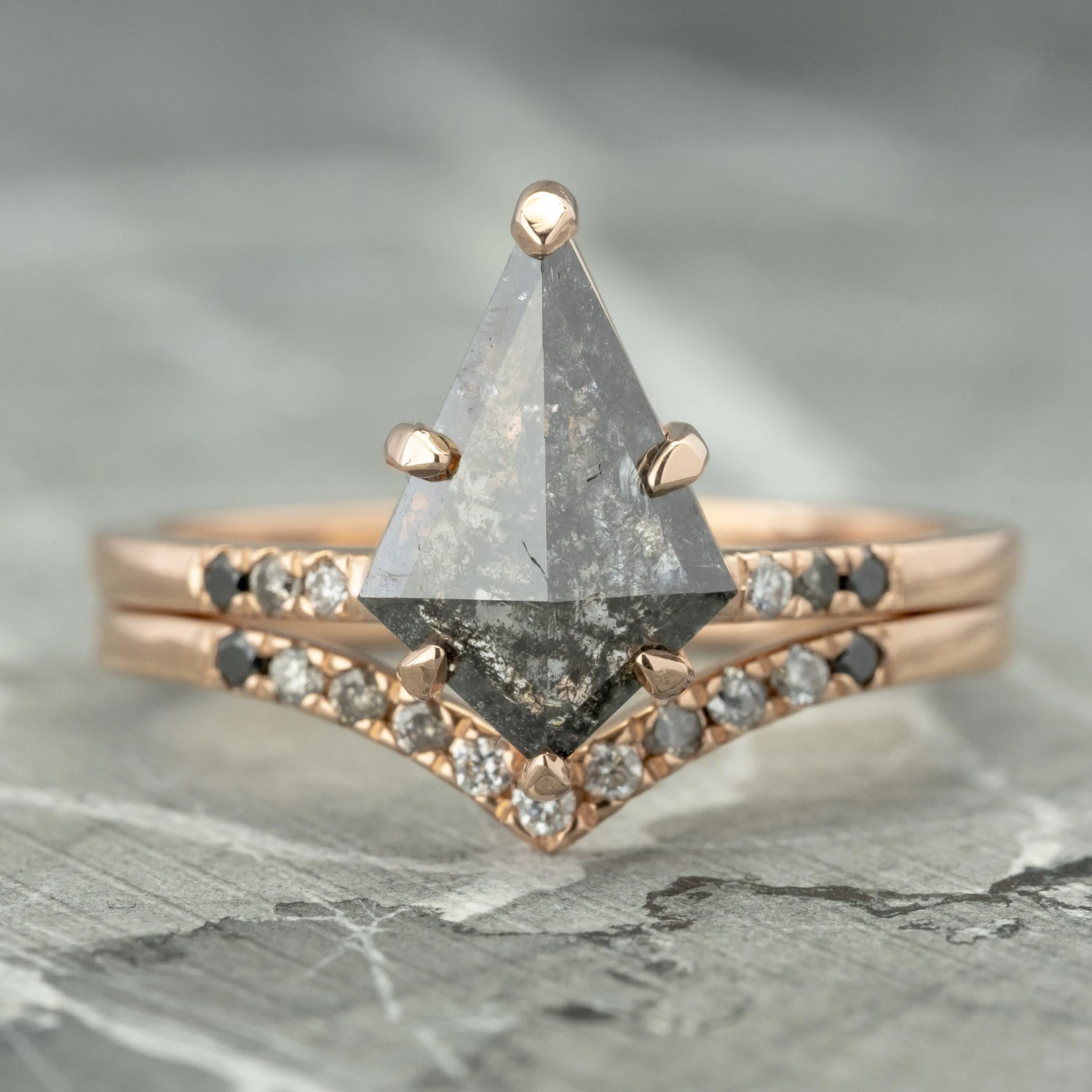 The V contour is formed by .11 carats of grey, black and white diamonds- 11 diamonds total are in the band.Â