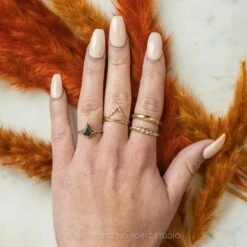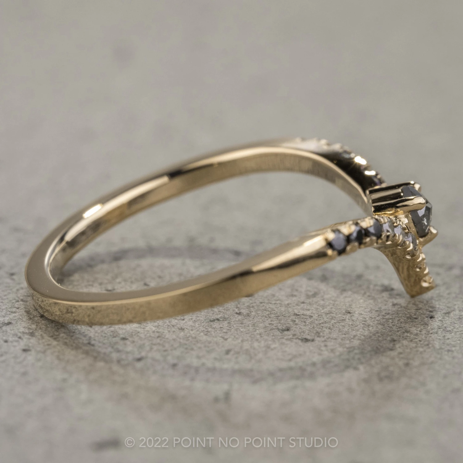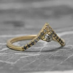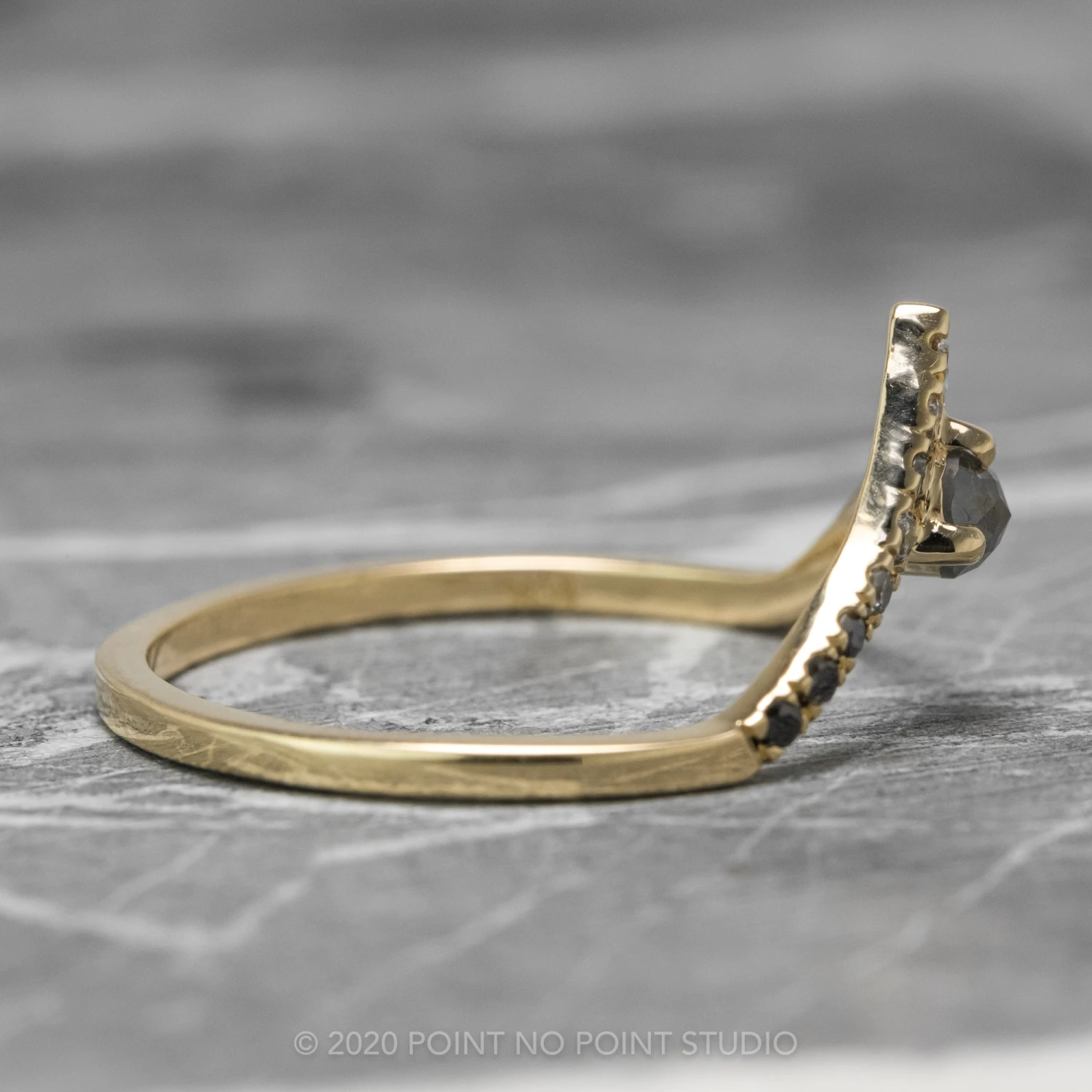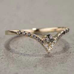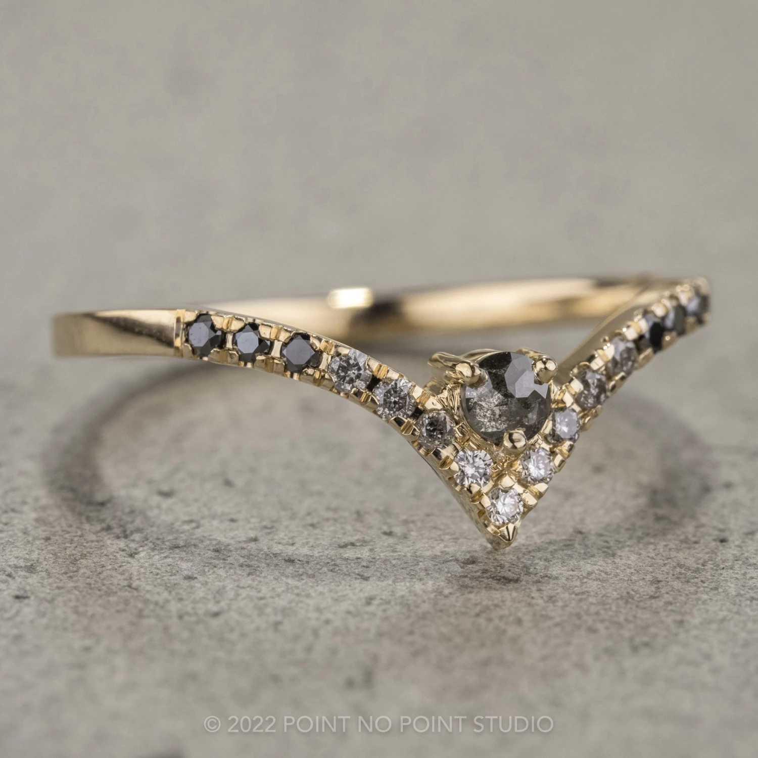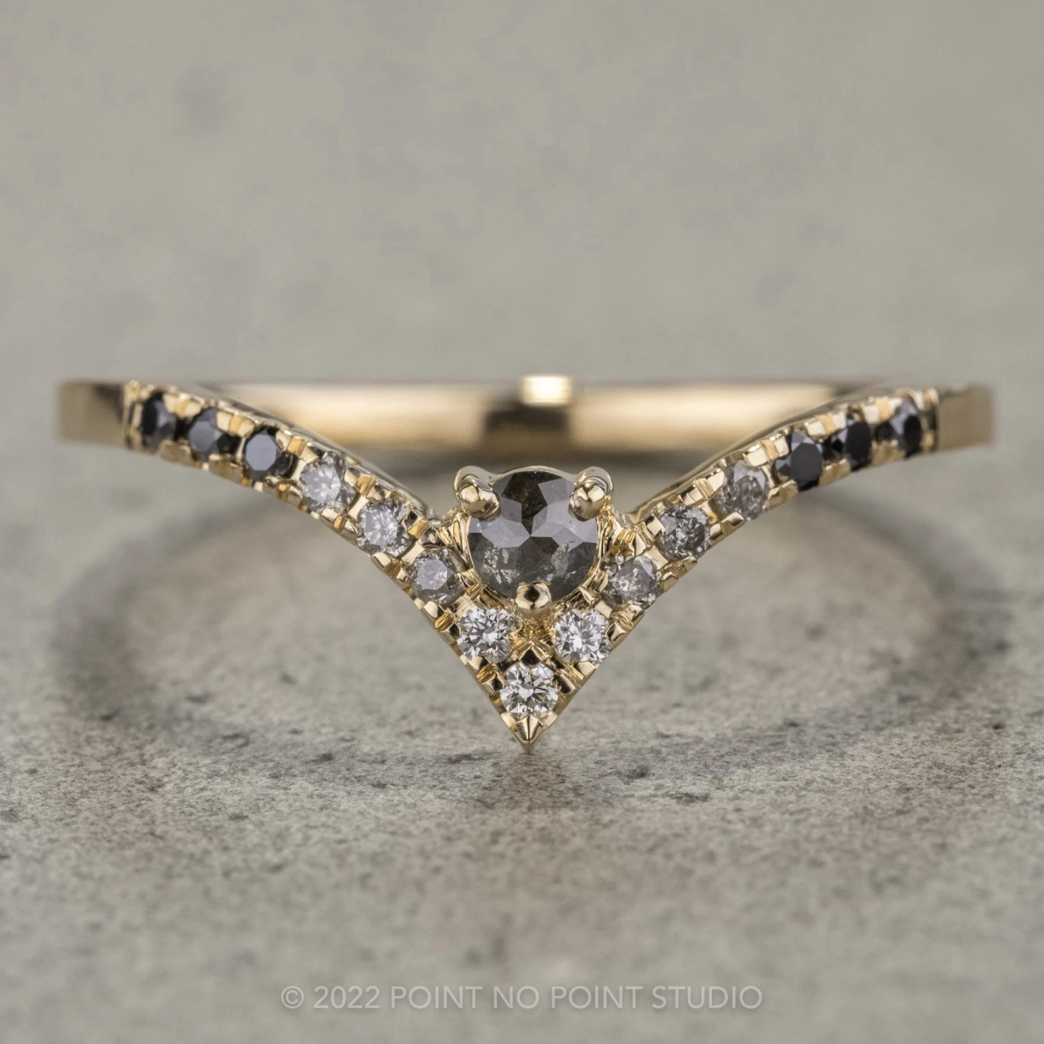 A simple hand crafted Ombre Diamond V shaped wedding band to be worn alone, stacked in multiples, or to match any number of engagement rings! The V contour is formed by .15 carats of grey, black and white diamonds. Set into the middle of the V is a beautiful round rose cut diamond.Â