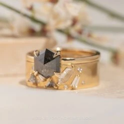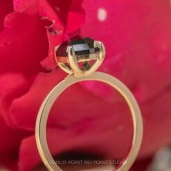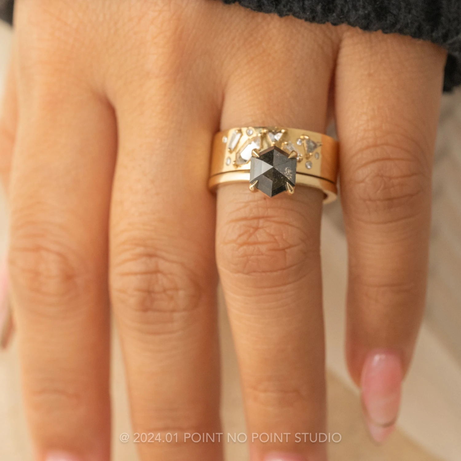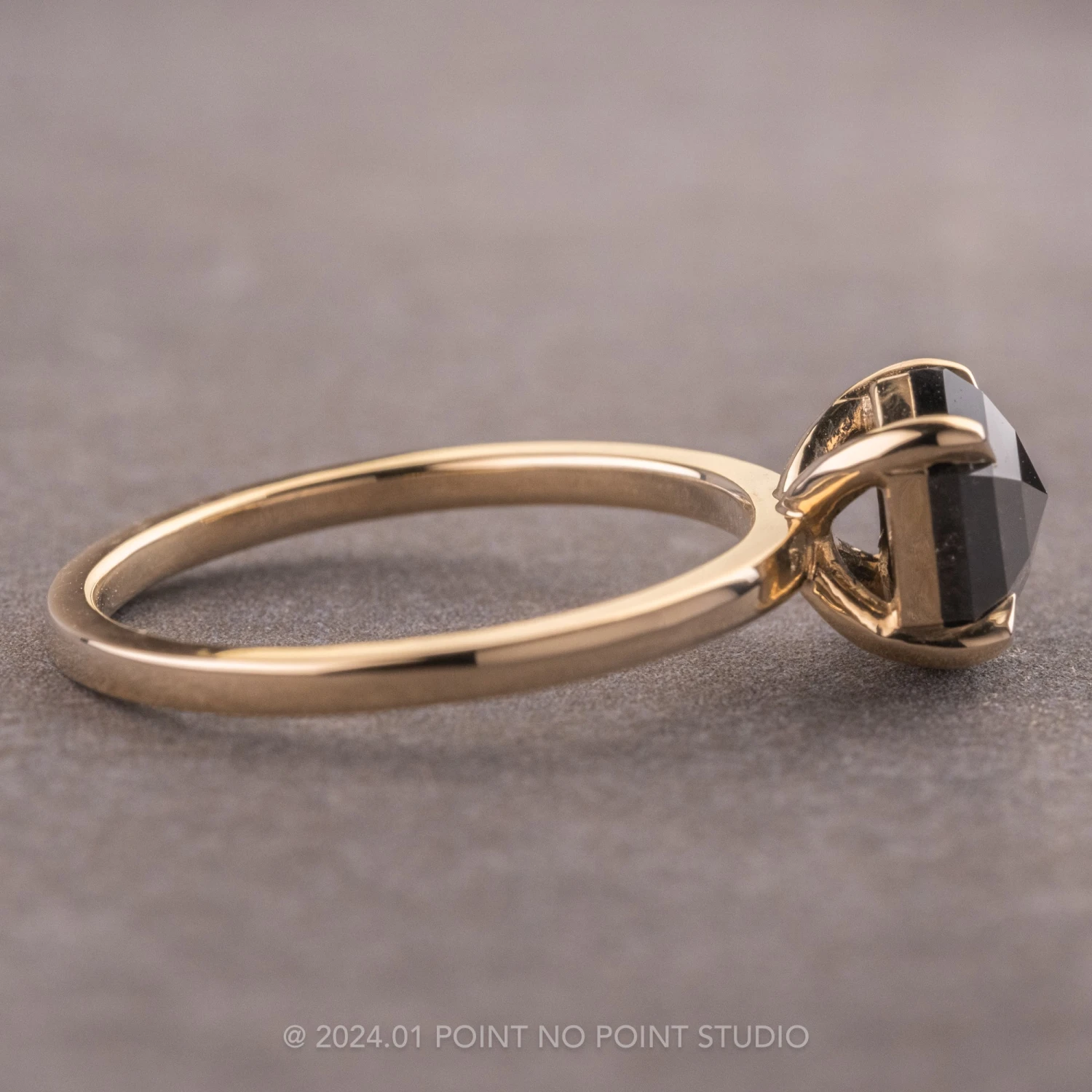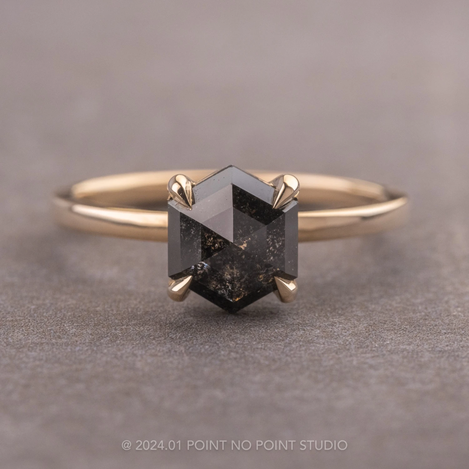The ring features a stunning 2.02 carat black speckled hexagon shaped diamond. The diamond is a top quality all-natural diamond that is not heat treated or enhanced in anyway – it it naturally semi-translucent with unique tones and facets that catch the light! Â