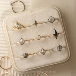 Included with your order – A Point No Point Studio digital ring certificate on a branded PNP USB drive, black velvet clam shell box, and a polishing cloth.