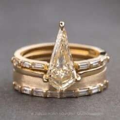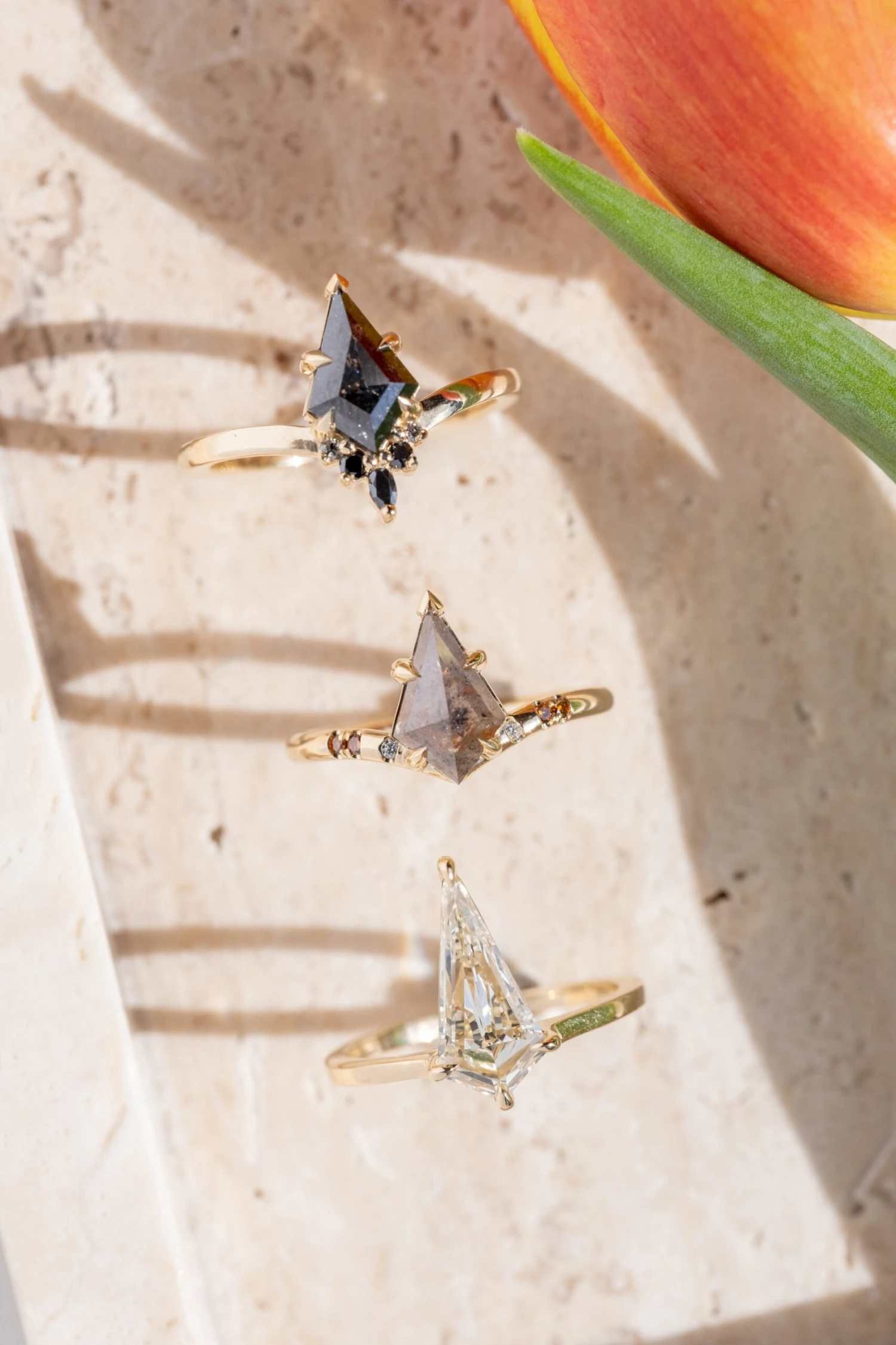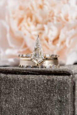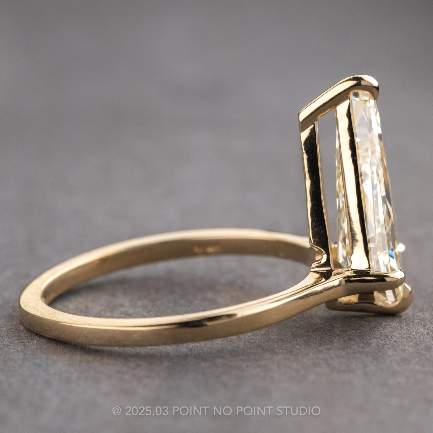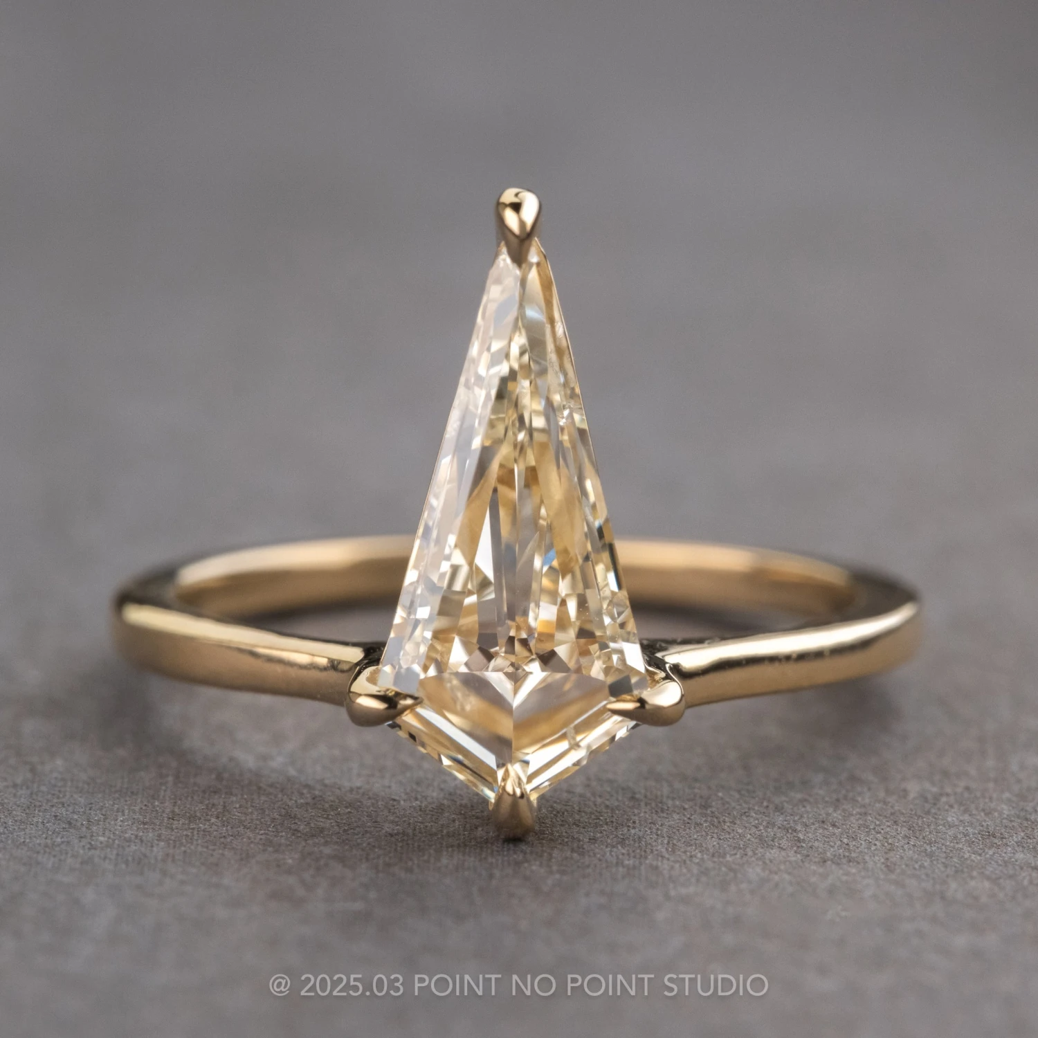 This engagement ring features a STUNNING 2.02 carat clear step cut kite shaped diamond. The diamond’s cut ensures maximum brilliance and fire, making it a truly captivating ring. The top quality, all-natural diamond has not been heat treated or enhanced in any way; it has been set into a 4 prong raised setting that is a combination of our basket and cathedral settings allowing it to shine brilliantly from every angle!