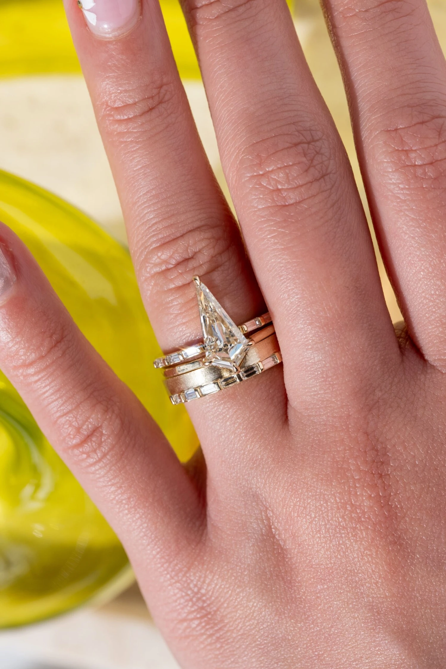 Shown pictured with our 3 Baguette Harper and Baguette Ellipse wedding bands, sold separately here.Â