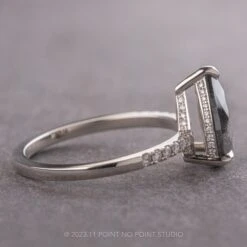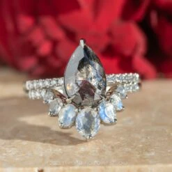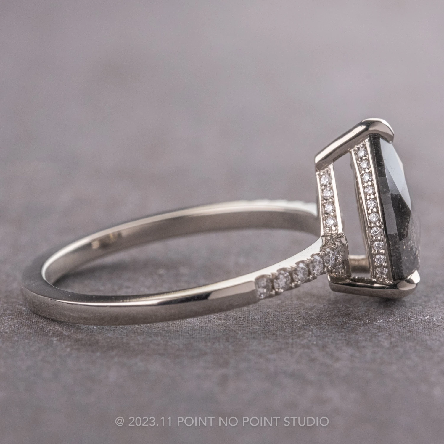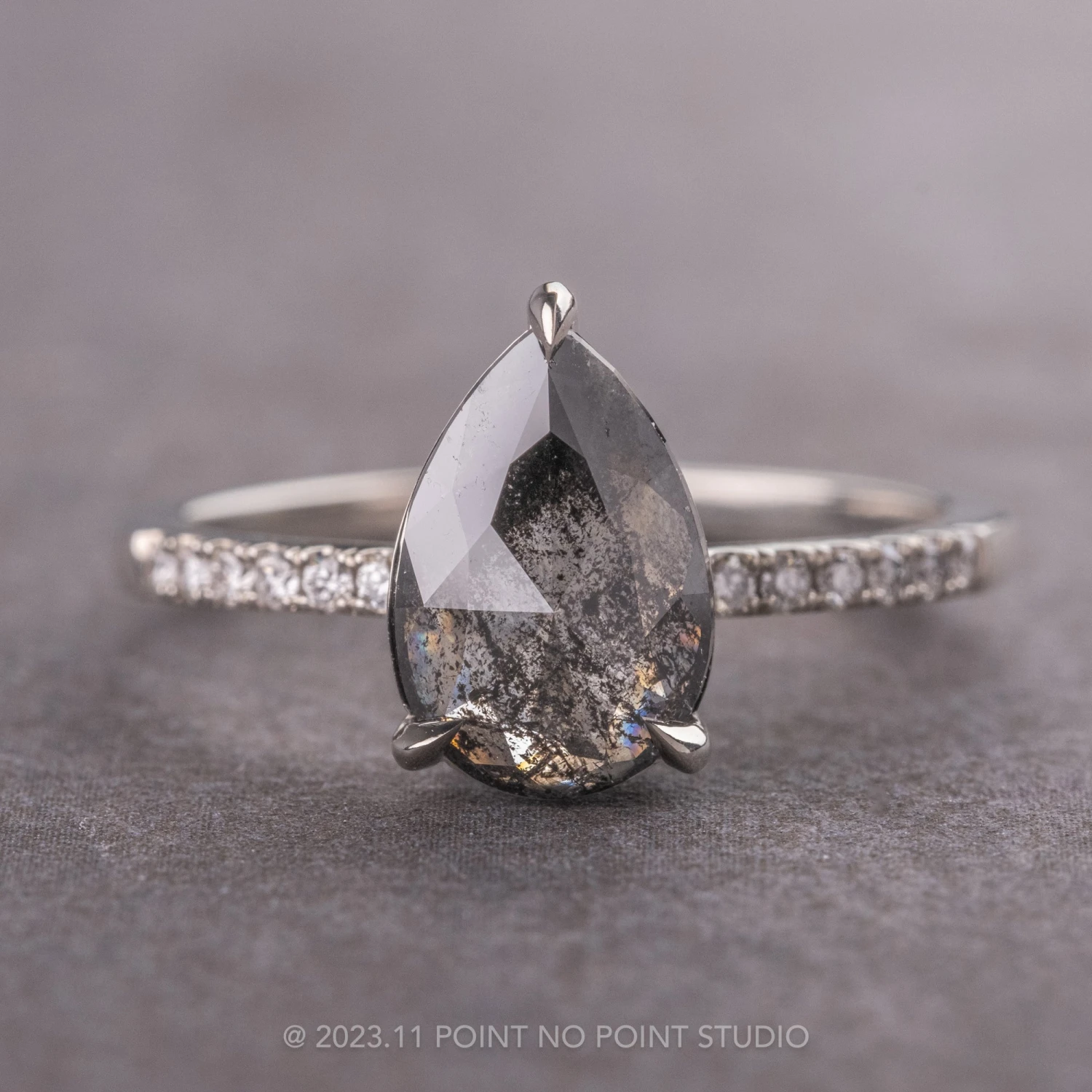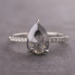 This captivating black speckled pear diamond engagement ring is a stunner! The ring features a rose cut pear shaped diamond. The diamond is a top-quality natural stone that has not been heat treated or enhanced in any way. The color and clarity of the diamond is semi-translucent with unique inner speckling. This setting has diamonds micro paved around the setting of the center diamond to give it extra sparkle!Â