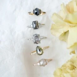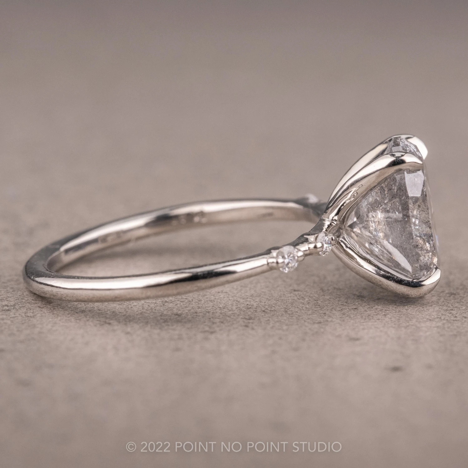This engagement ring set features a mesmerizing and incredibly sparkly 2.10 carat salt and pepper oval, brilliant cut diamond, flanked on either side by white accent diamonds in the band.