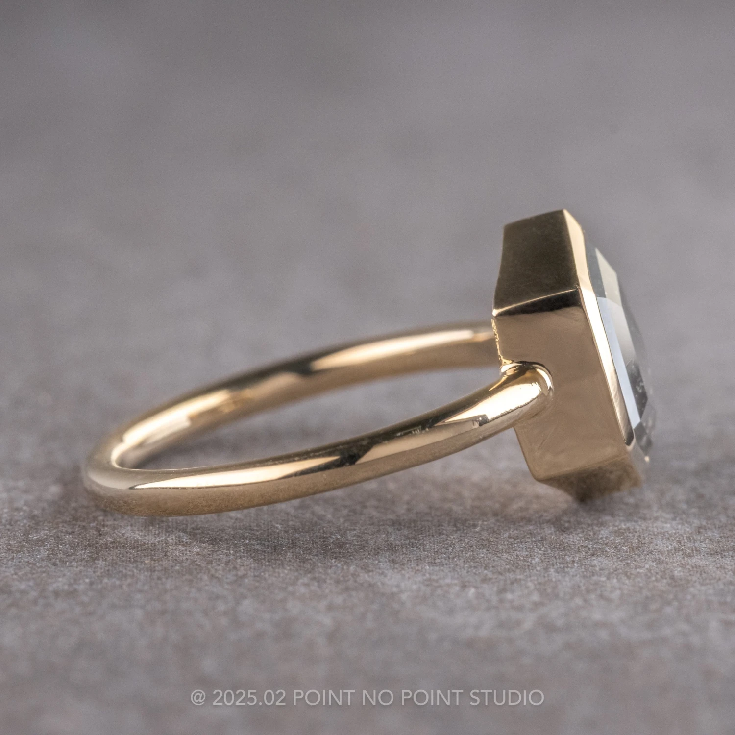 The rose cut diamond has been set in a low-profile bezel setting. The bezel fully encompasses the hexagon diamond. The entire ring is made of eco-friendly recycled 14k yellow gold and sits directly on the finger making this ring extremely comfortable to wear.Â
