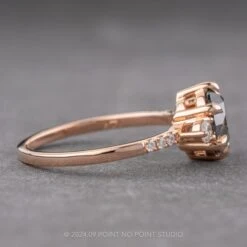This engagement ring features a mesmerizing and incredibly sparkly 2.05 carat black speckled round brilliant cut diamond. The diamond is an all-natural stone that has not been heat treated or enhanced in any way; it is semi-translucent with unique tones and facets that catch the light. Flanked on both sides by a GHSI white round brilliant cut accent diamond, followed by three smaller GHSI white round brilliant cut diamonds set into the ring band to complete the look!Â