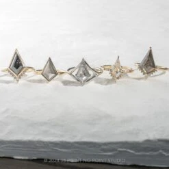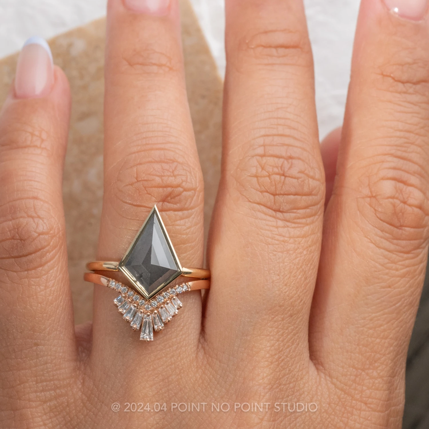 This ring features a striking 2.23 carat salt and pepper rose cut kite diamond. This diamond sits in a bezel setting with an open back that allows light to shine through so you can admire the beautiful inclusions in the stone.