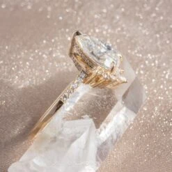 This timeless engagement ring features a stunning brilliant cut pear moissanite. This ring has a half halo of sparkling white diamonds and 5 diamonds in the band that beautifully compliments the center stone. This unique setting has diamonds micro-paved around the center diamond basket giving the ring an extra hidden sparkle!Â