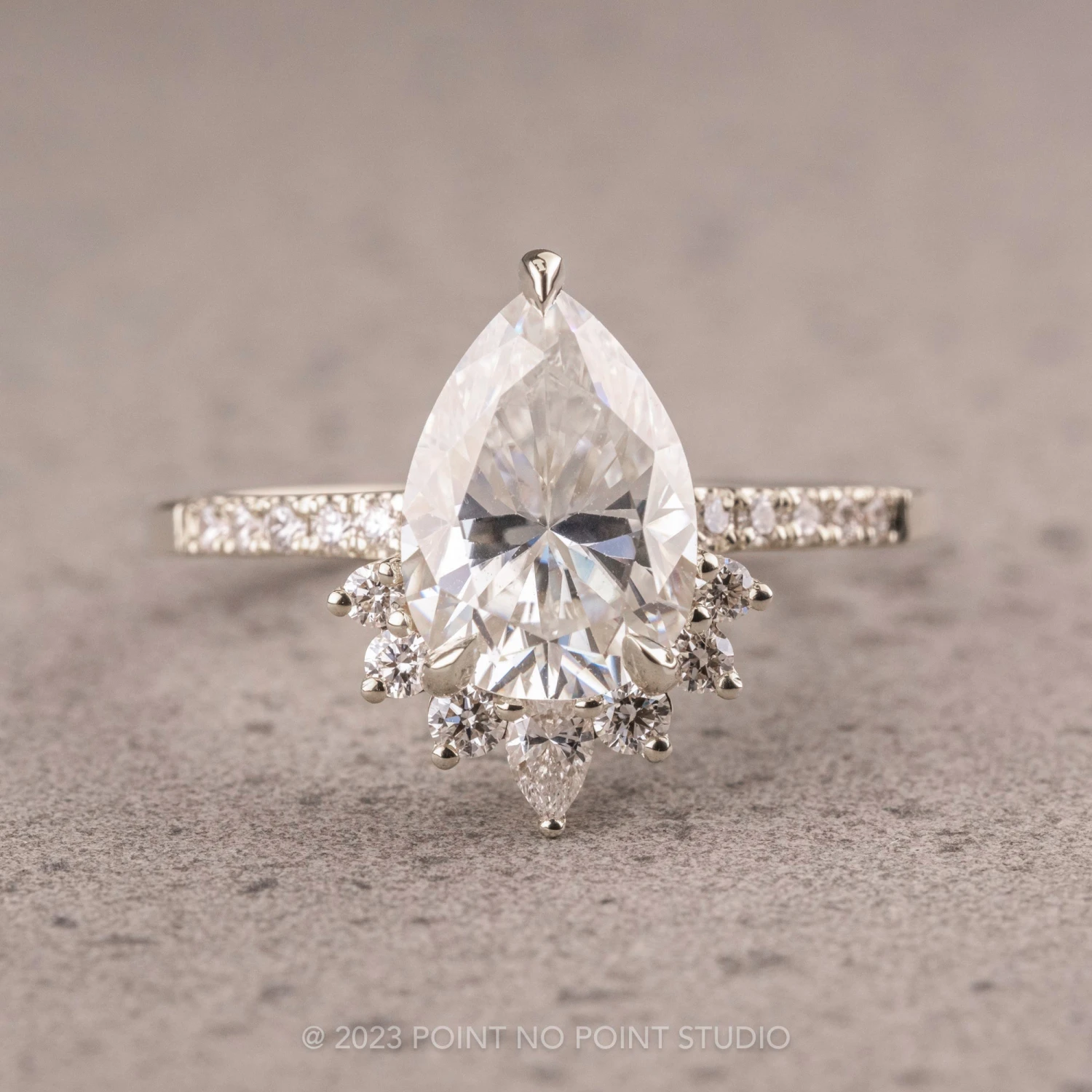 This timeless engagement ring features a stunning brilliant cut pear moissanite. This ring has a half halo of sparkling white diamonds and 5 diamonds in the band that beautifully compliments the center stone. This unique setting has diamonds micro-paved around the center diamond basket giving the ring an extra hidden sparkle!