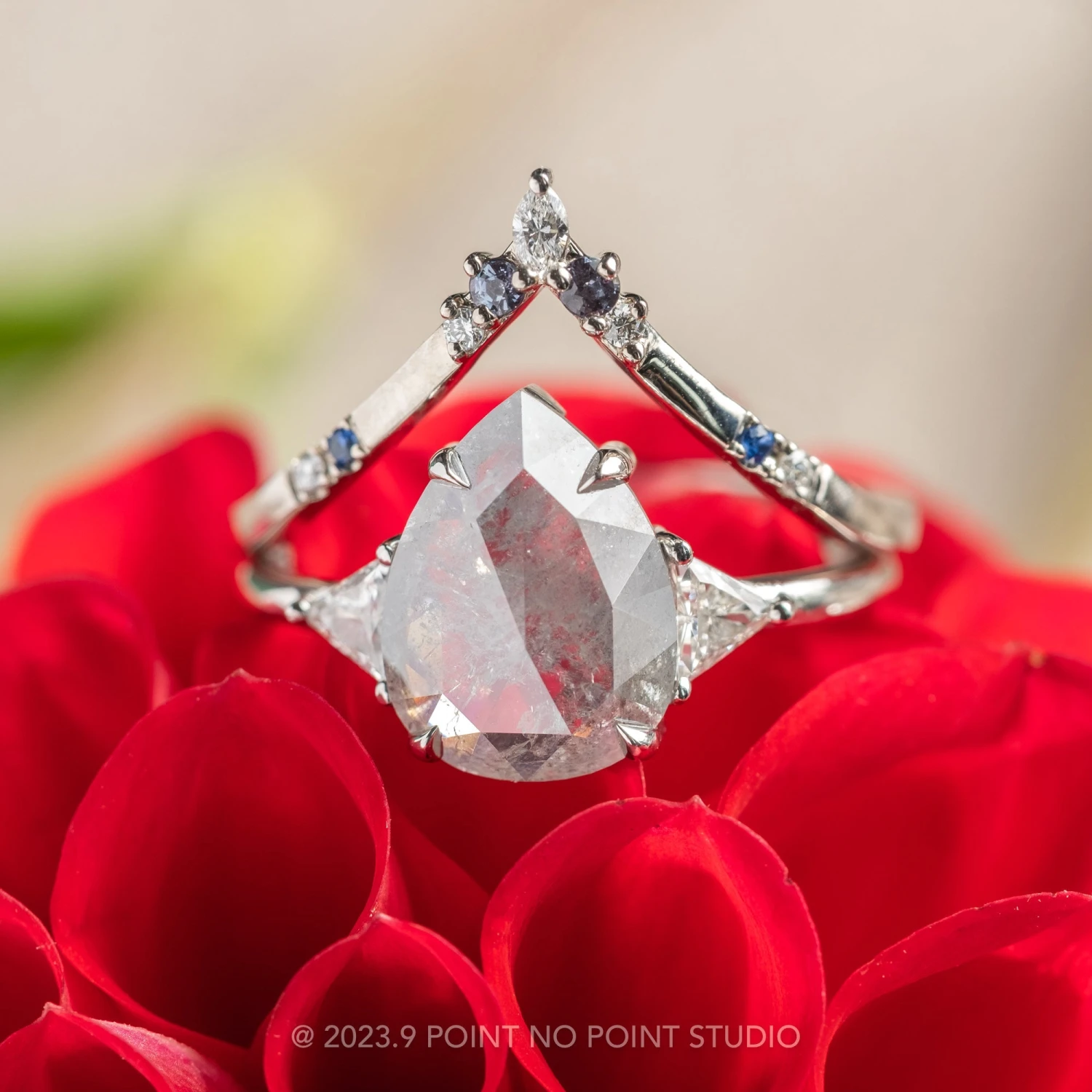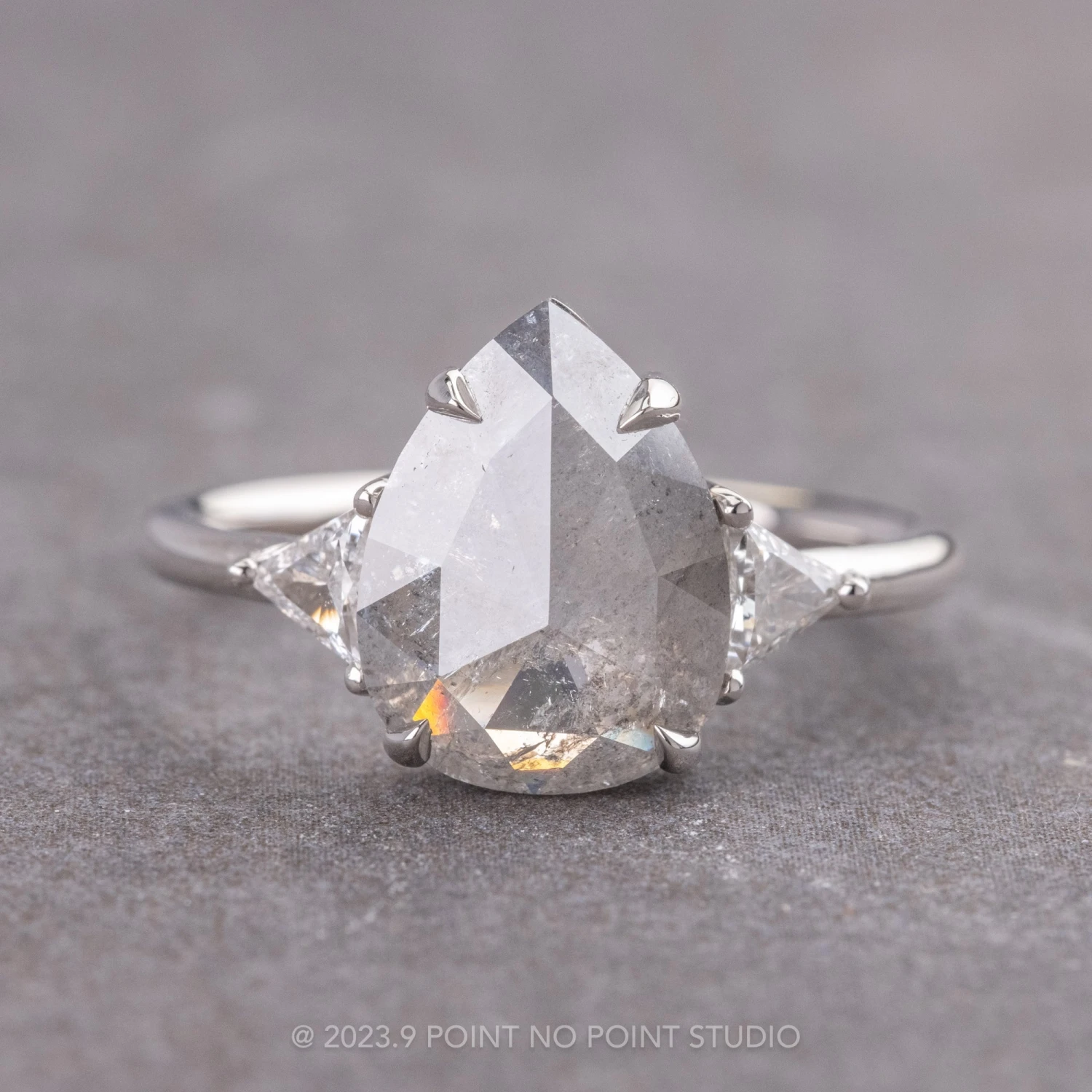 This ring features a beautiful 2.29 carat grey toned salt and pepper rose cut pear shaped diamond. The diamond is a top quality, un-enhanced diamond; it is semi translucent with unique tones and facets that catch the light. Set on either side of the center stone are sparkly white triangle diamonds.