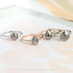 This engagement ring features a mesmerizing and incredible 2.41 carat black speckled hexagon diamond. The diamond is a top quality, un-enhanced diamond; it is semi-translucent with unique tones and facets that catch the light. Flanked on either side by GHSI white round accent diamonds followed by an ombre of smaller round accent diamonds that gradient in color.Â