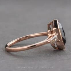 The rose cut hexagon diamond has been set in a raised bezel setting. The bezel fully encompasses the diamond. The entire ring is made of eco-friendly recycled 14k rose gold and sits slightly raised off the finger.Â