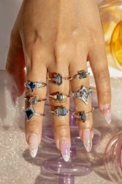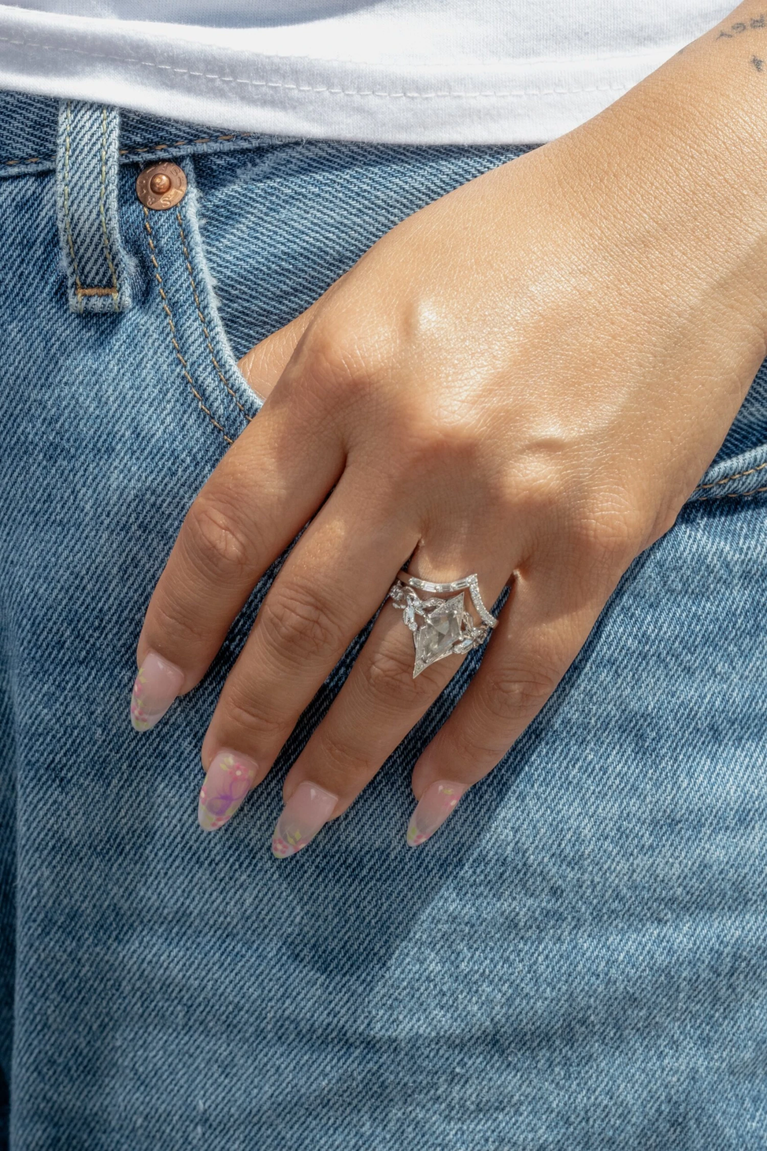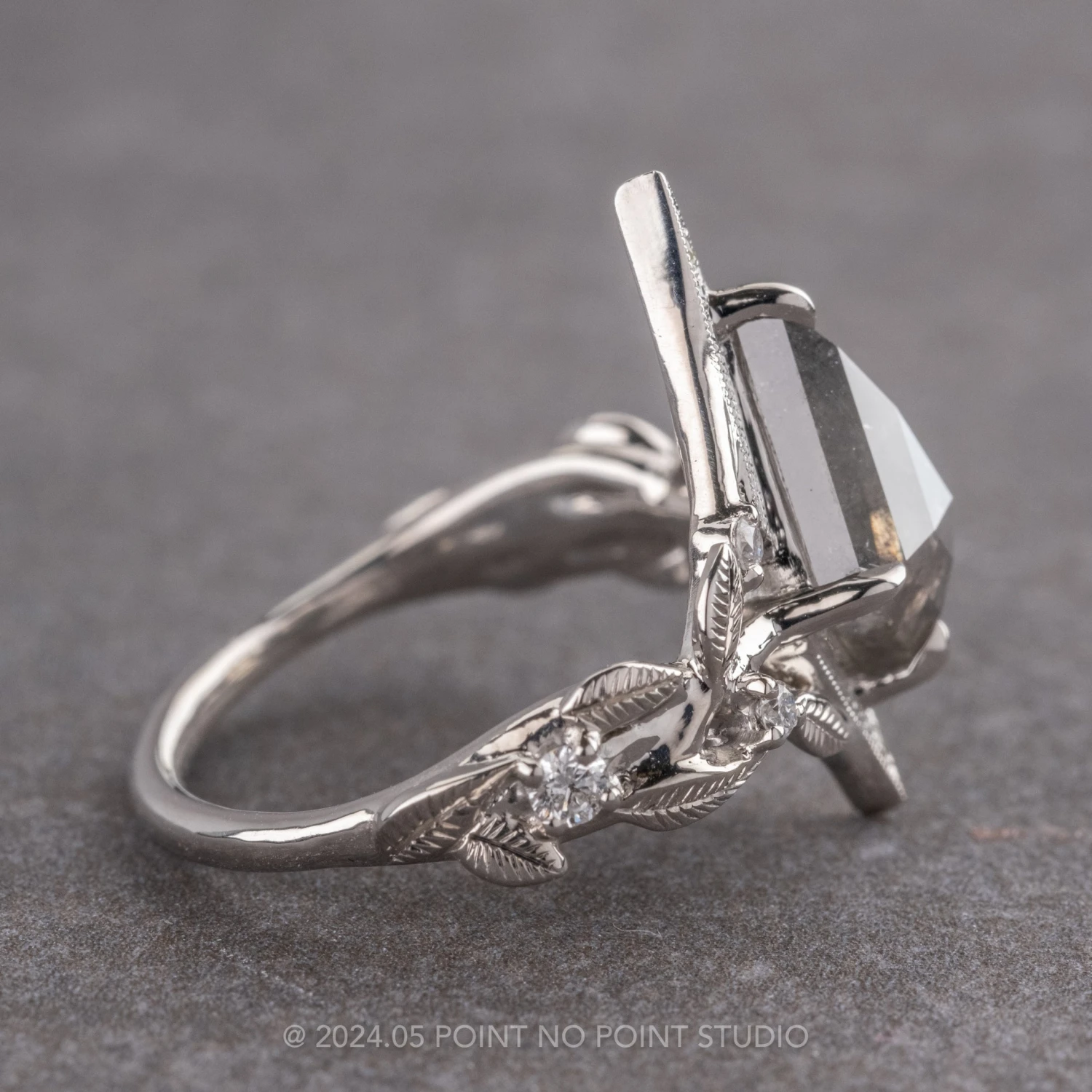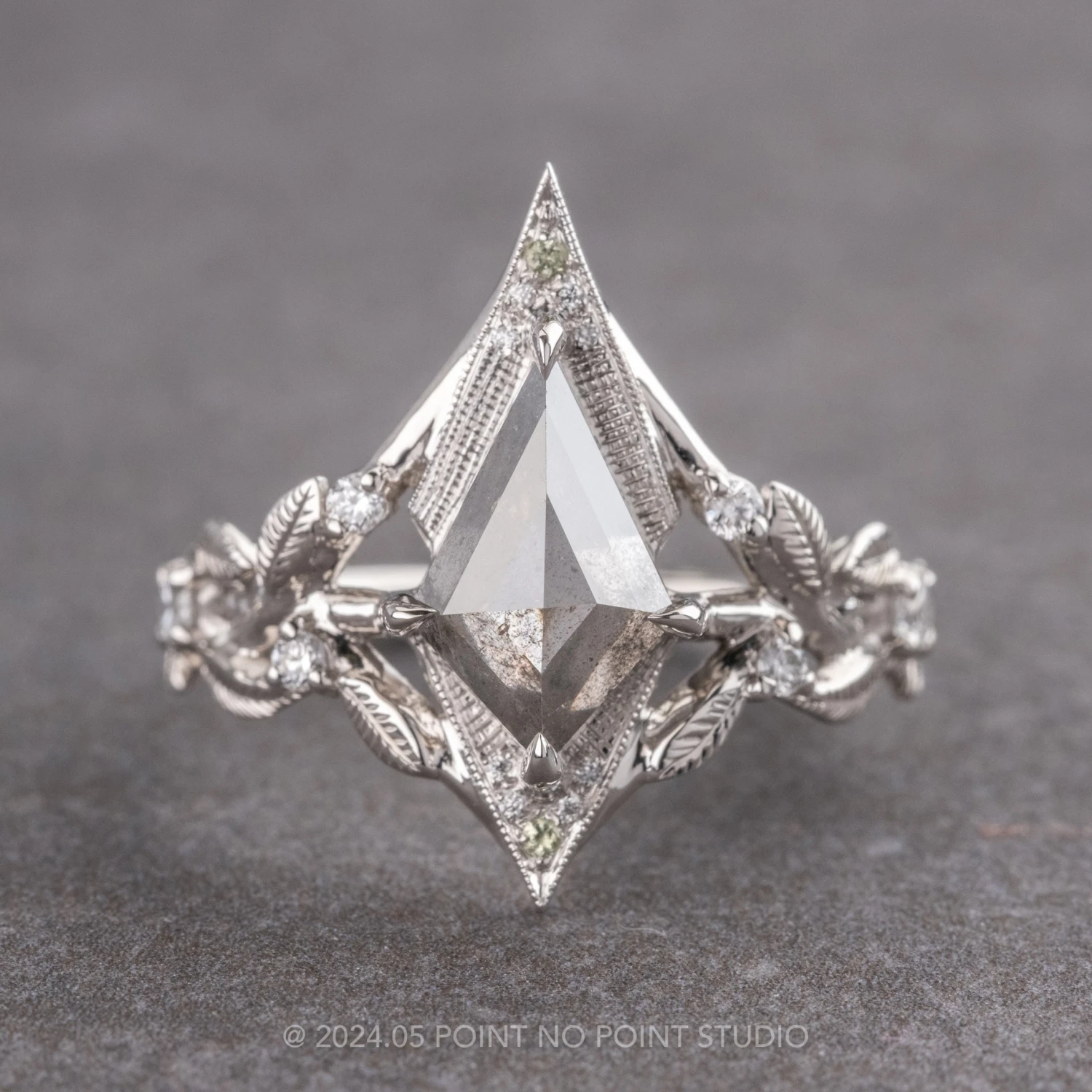 This captivating salt and pepper kite diamond engagement ring is a stunner! The ring features a 2.71 carat grey salt and pepper rose cut kite shaped diamond. The diamond is a top quality natural stone, it is semi-translucent with unique tones and facets that catch the light. The kite is set into an open back setting to allow light to illuminate through the diamond.Â
